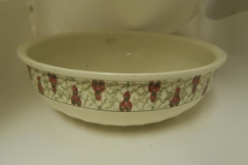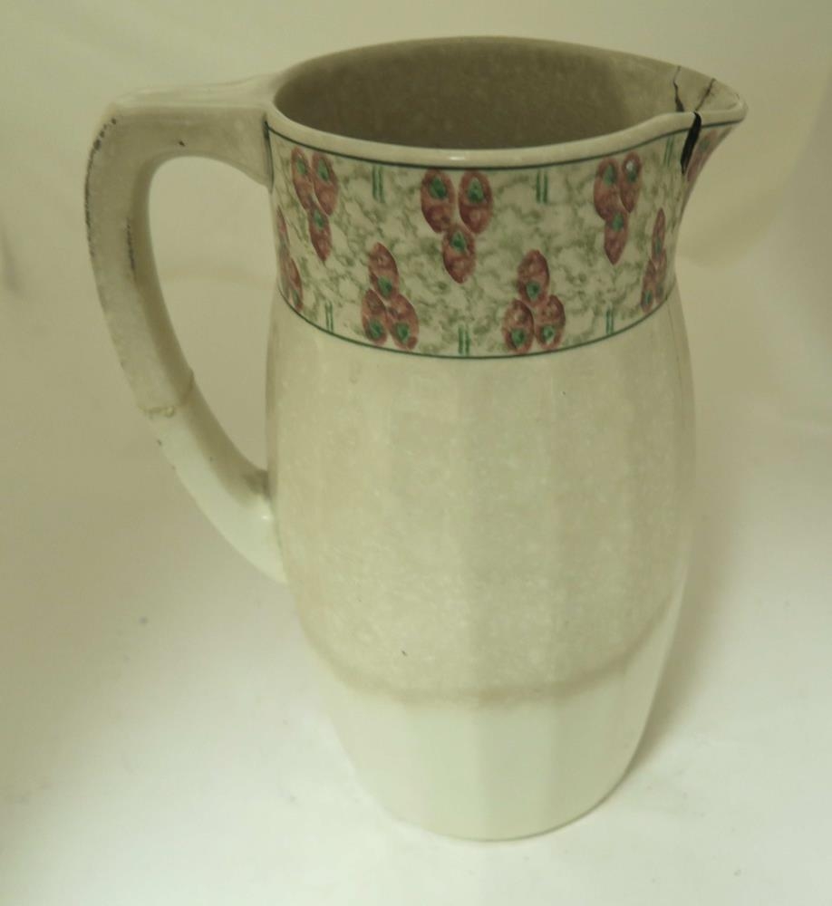 Vatnskanna og þvottaskál. Áletrun á könnu: Villeroy og Boch 5019. Litur hvítur með útflúraðan stút. Þvermál 13,5, hæð 31 sm. Þvottaskál í sama stíl. Áletrun á skál: Villeroy og Boch 5019. Litur hvítur. Þvermál. 39,5, hæð 12,5 sm. Þvottaskálin sem fylgir vatnskönnunni er á sama númeri.