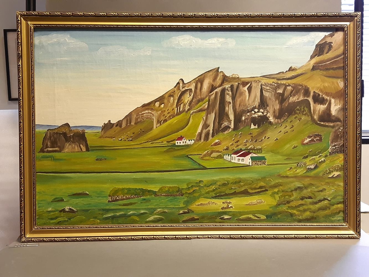 Olíumálverk af Drangshlíð að sumarlagi, horfir í vestur. Myndin sýnir bæjarhúsin, túnin og Dranginn í forgrunni, með hlíðina í bakgrunni. Myndin er ómerkt og málarinn óþekktur. Hún er í gylltum ramma.