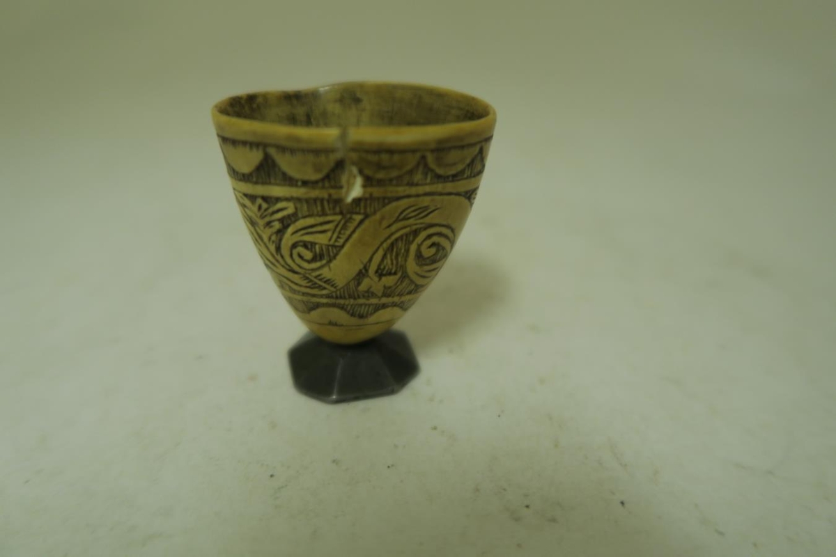 Hornstaup á tinfæti (- stétt) 4,7 sm á hæð. Fagurlega útskorið. Skarð í barmi. Merkt neðan á stétt: E.M. Skorið af Erlendi Magnússyni gullsmið.