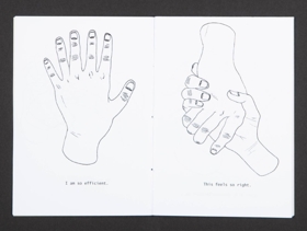 Svart prent á hvítan pappír. Handsaumað. Tekiningar af höndum og texti á ensku.