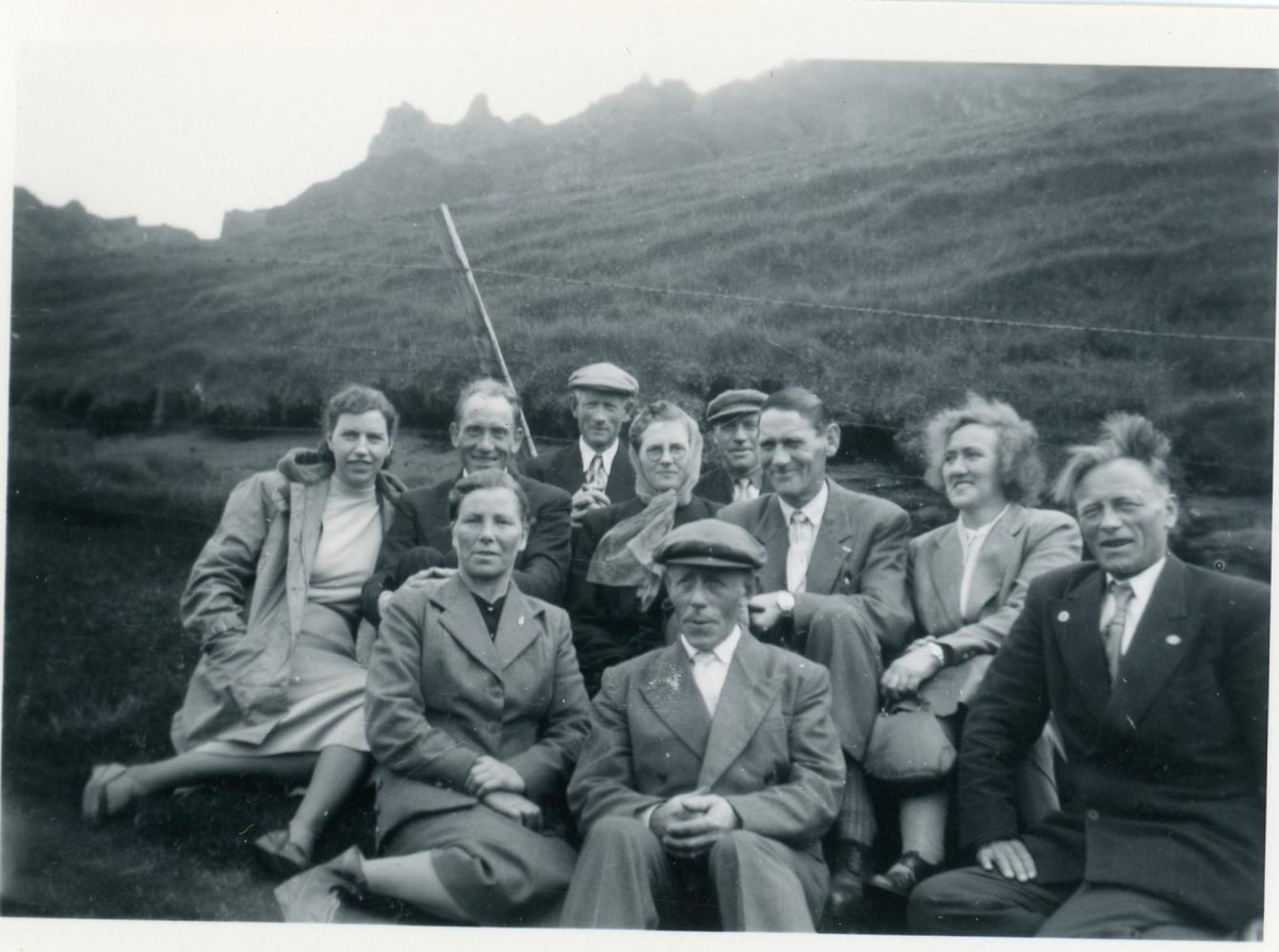 Hópur fólks situr í grasbrekkur með girðingu fyrir aftan sig og kletta enn lengra í burtu. Við myndina er skrifað "Úr Kaldrananeshreppi" og er þetta fólkið á myndinni: