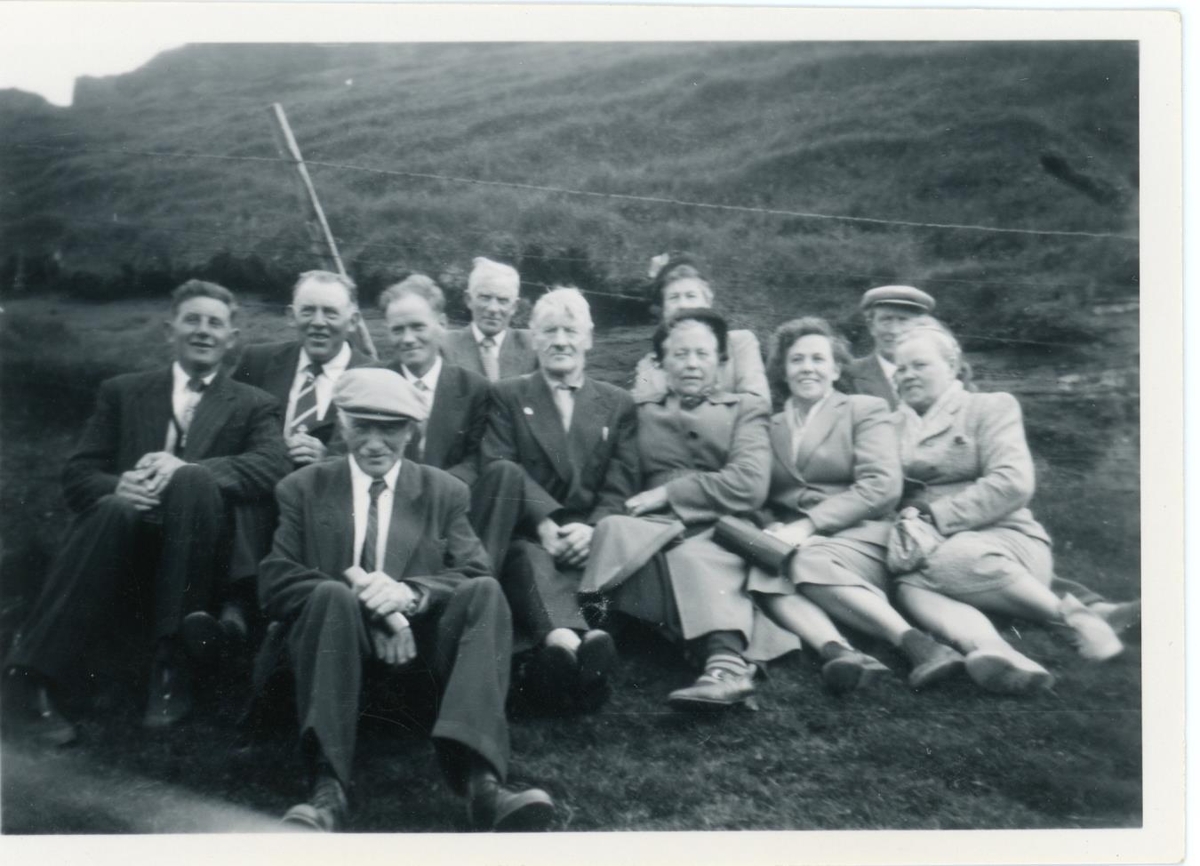 Ellefu manns sitja saman í hnapp í grasbrekku, með girðingu fyrir aftan sig. Undir myndina er skrifað "Frá Hólmavík".