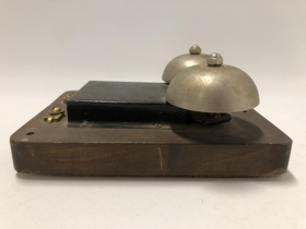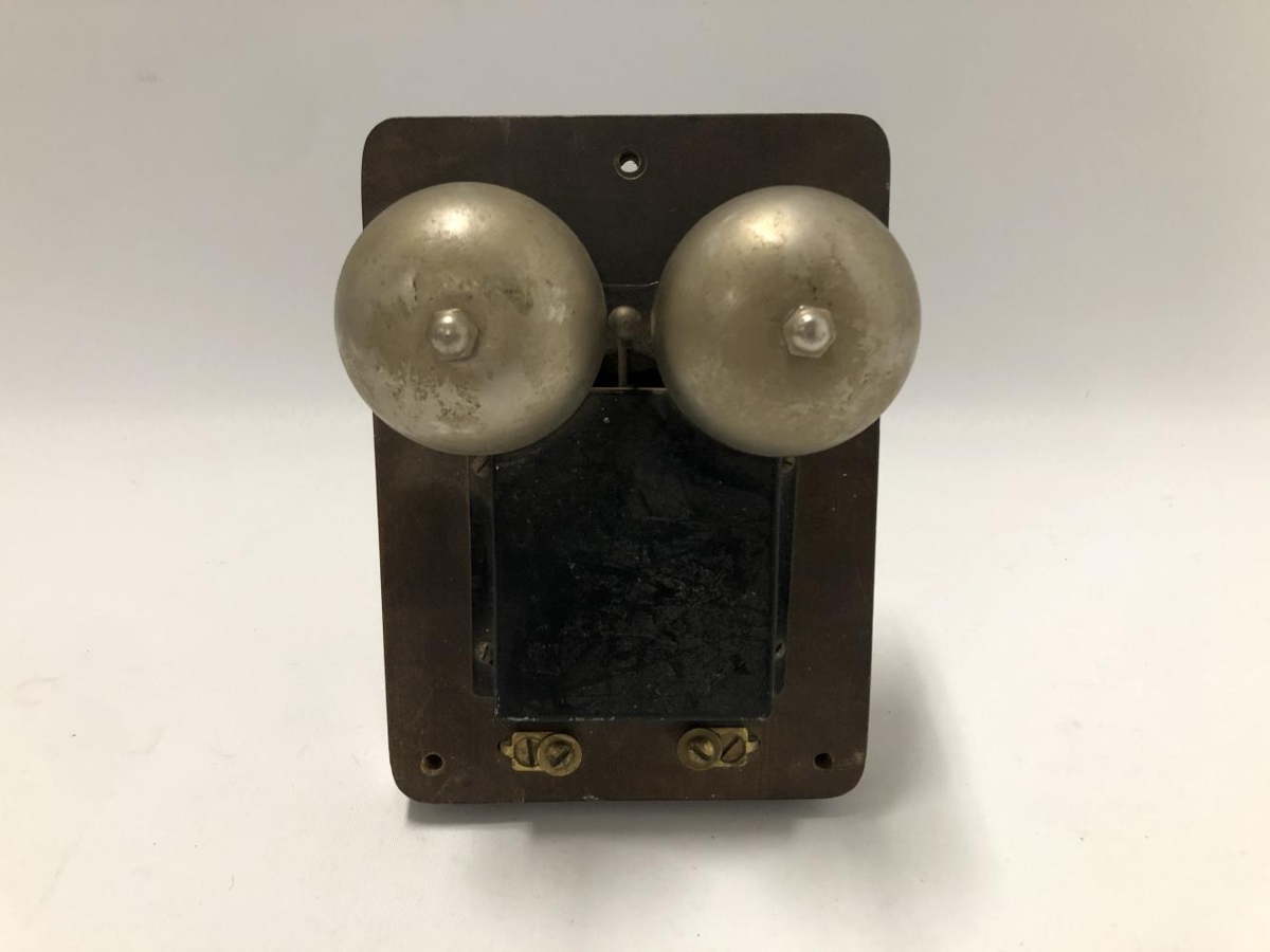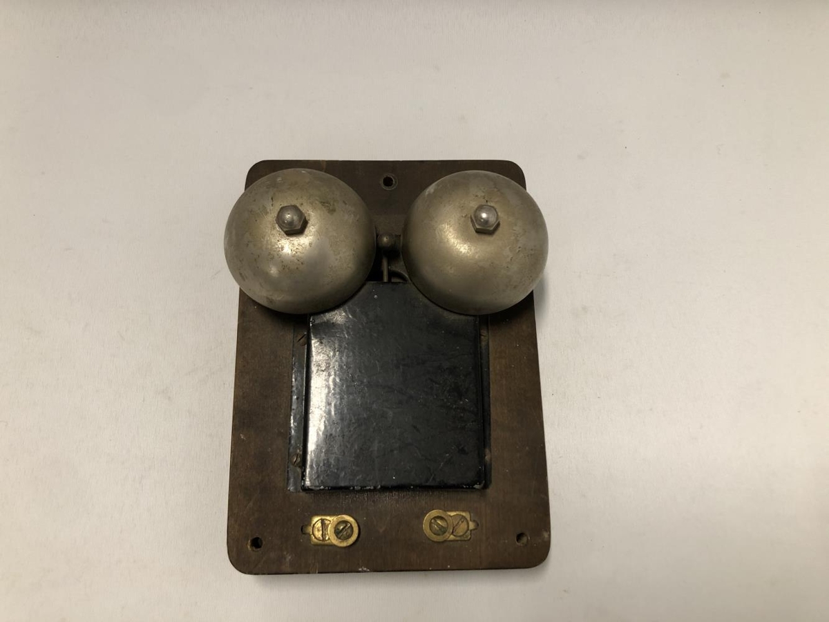 Símabjalla . Dökk viðarplata, lokuð að aftan með viðarspjaldi. Svartur málmkassi að framan og upp úr honum festingar fyrir tvær málmbjöllur og lítinn "kólf" á milli þeirra. Bjalla þessi er af síma sem var á Kiðjabergi til 1970.