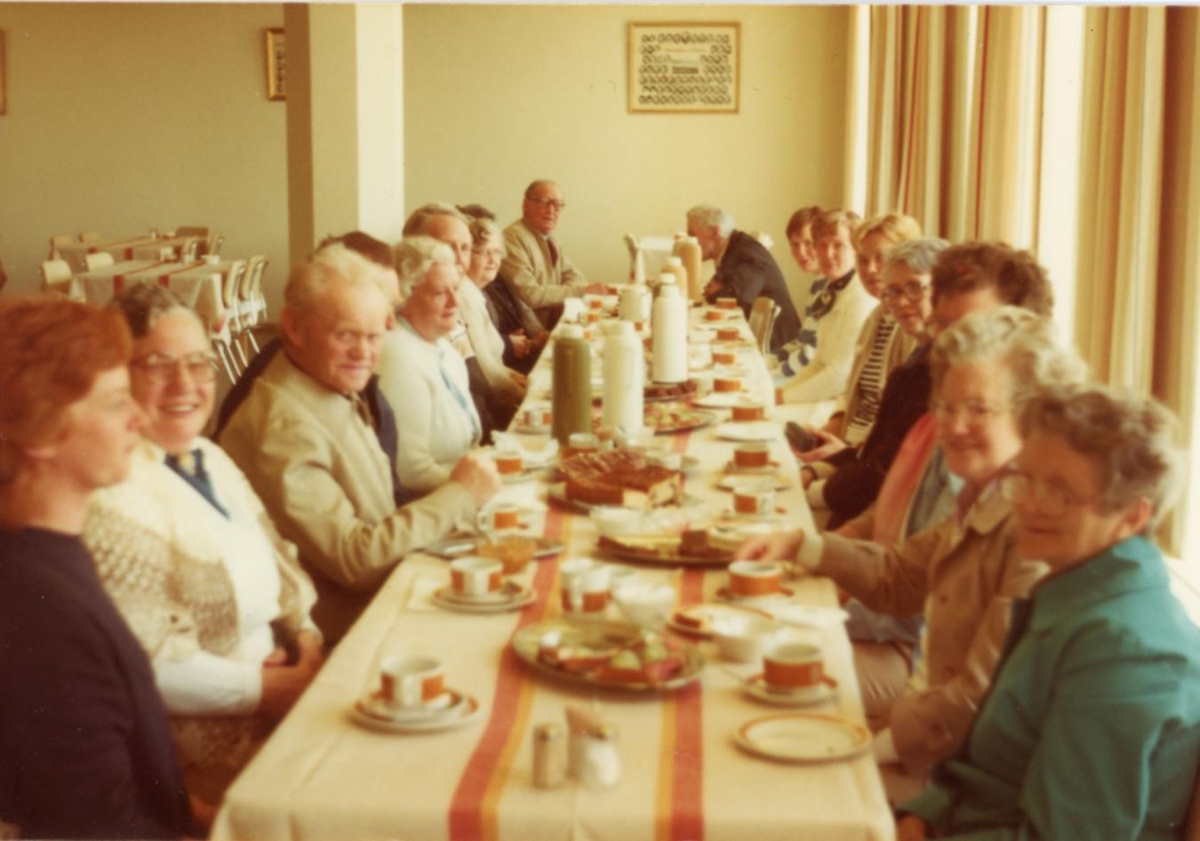 Hópur fólks situr sitt hvoru megin við langt borð, hlaðið veitingum, kaffibollum með undirskálum, kaffikönnum og slíku. Til hægri er gluggi. Myndin er tekin í Reykjaskóla þegar kvenfélagið Björk bauð eldri borgurum úr Tungusveit í ferð.