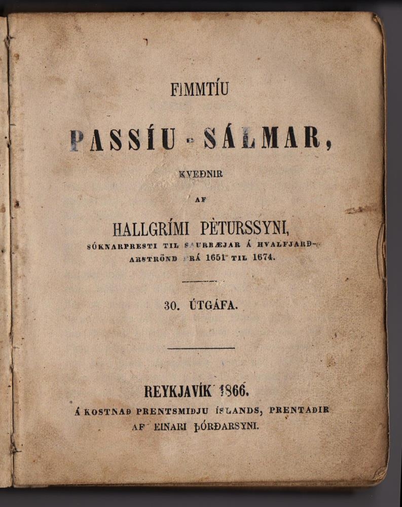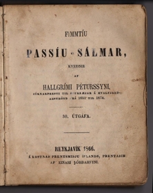 Fimmtíu Passíusálmar Hallgríms Péturssonar (1614-1674). Útgefið af Prentsmiðju Íslands árið 1866 í Reykjavík. Á titilblaði stendur að sé 30. útgáfa en rétt er að sé 33. prentun. 176 bls, en í þetta eintak vantar bls 175-176. Sæmilegt ásigkomulag. Gefandur eru systkinin Steinbjörg Guðmundsdóttir og Sigurður Guðmundsson (1888-1970) frá Traðarbakka á Akranesi