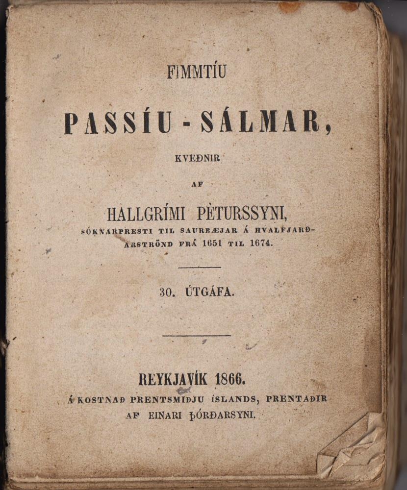 Fimmtíu Passíusálmar Hallgríms Péturssonar (1614-1674). Útgefið af Prentsmiðju Íslands árið 1866 í Reykjavík. Á titilblaði stendur að sé 30. útgáfa en rétt er að sé 33. prentun. 176 bls. Sæmilegt ásigkomulag. Gefand Magnús Halldórsson (1877-1973)