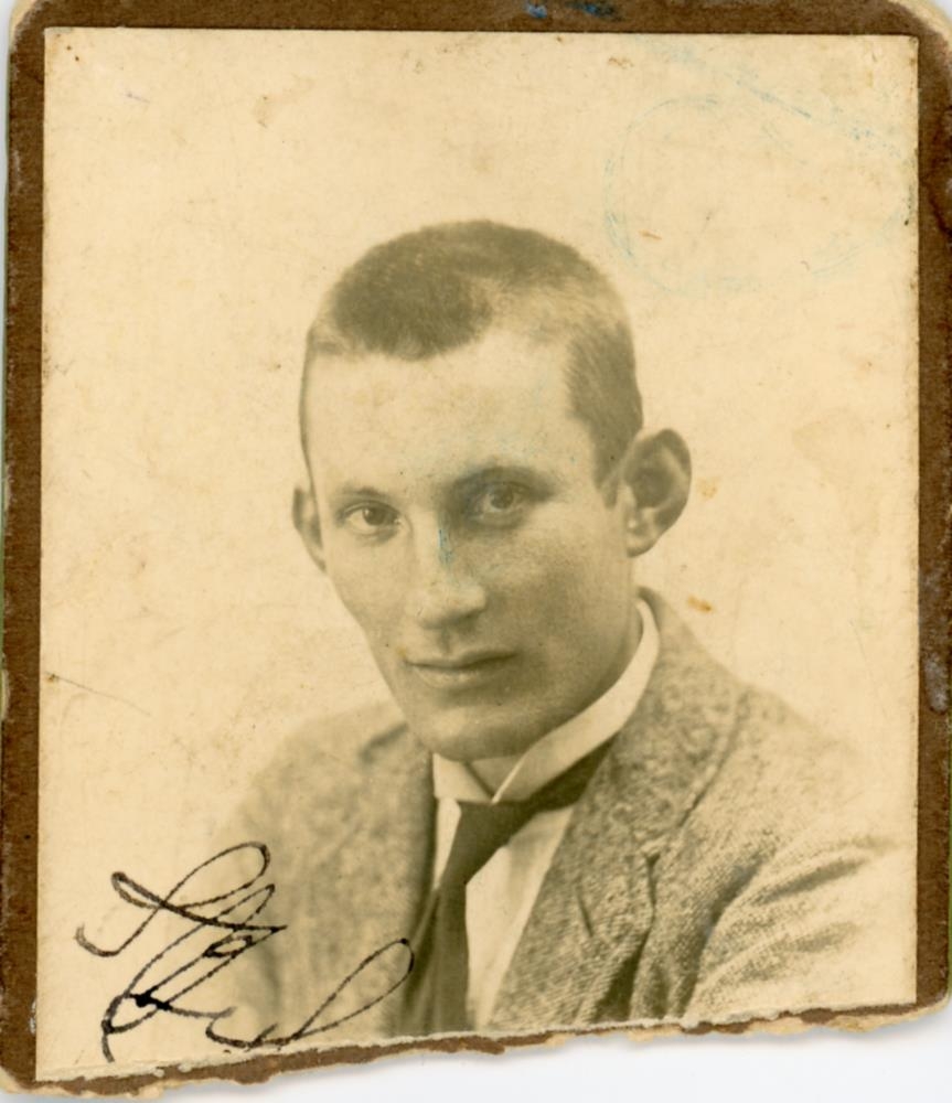 Stutthærður maður með langt andlit, skegglaus, í jakka og með bindi. Maðurinn er Skeggi Samúelsson frá Gröf.