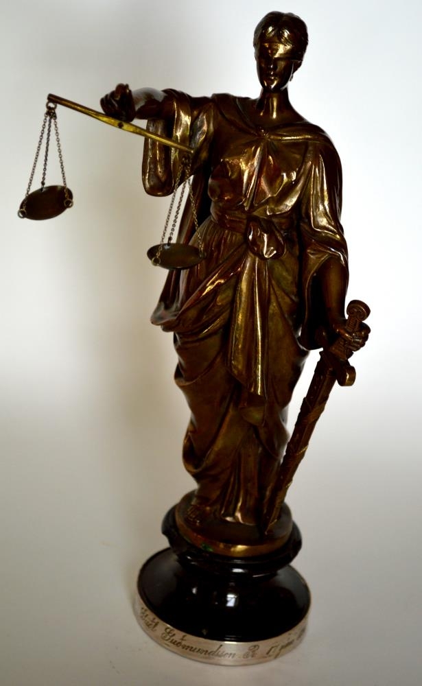 Koparstytta; gyðja réttvísinnar, 30 cm á hæð. Silfurgjörð utan um fótstall og er þetta á letrað:" Guðl. Guðmundsson R. 17. júní 1881-20. júlí 1904". Frá Skaftfellingum. Guðlaugur varð bæjarfógeti á Akureyri 1904. Framleiðslumerki á styttu: Oscar Gladenbec. Gefandi Guðlaugur Hjörleifsson frá Reykjavík, sonur Soffíu Guðlaugsdóttur leikkonu; hlutir úr eigu Guðlaugs Guðmundssonar sýslumanns á Kirkjubæjarklaustri, f. 1856, d. 1913.