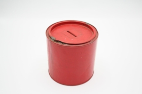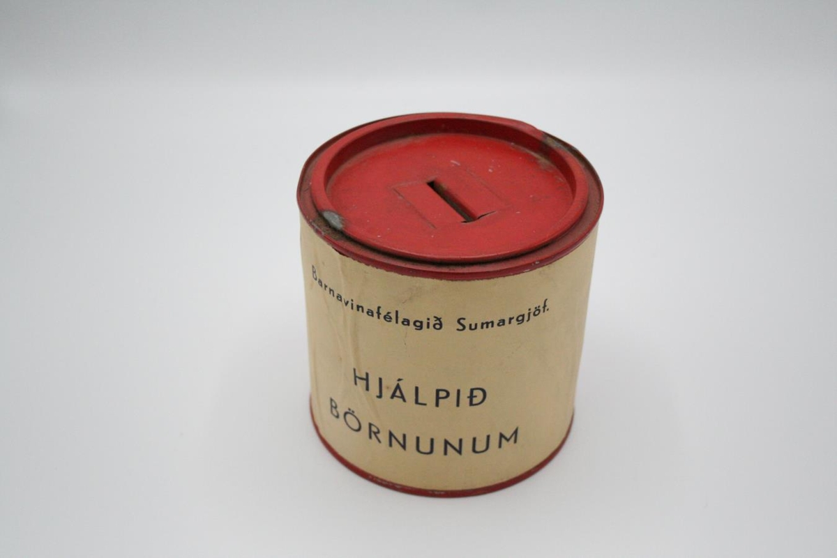 Rauður söfnunarbaukur. Á bauknum er miði sem stendur á "Barnavinafélagið Sumargjöf. Hjálpið börnunum". Baukurinn var notaður við fjáröflun fyrir byggingu og rekstri dagheimila og leikskóla í Reykjavík og var það jafnan gert á sumardaginn fyrsta.