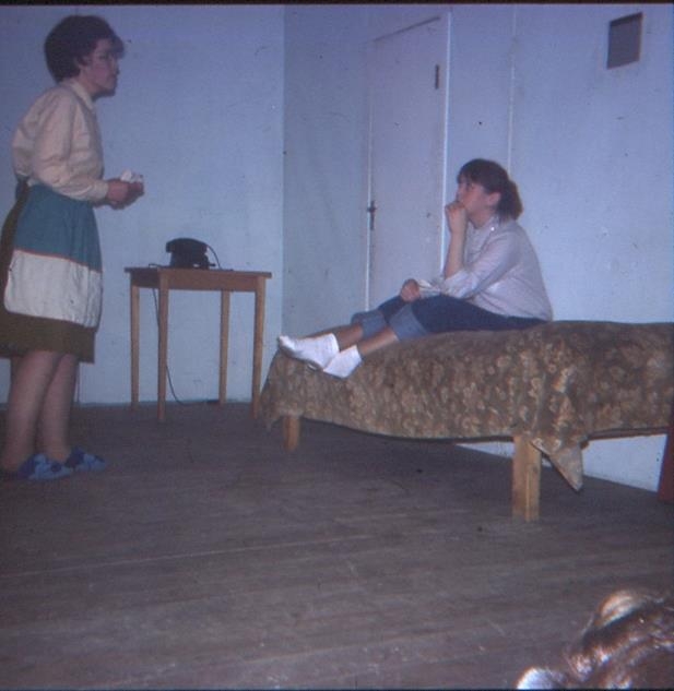 Tvær konur leiksviði. Sú til vinstri er í ljósri blússu, í pilsi, með svuntu og í inniskóm. Á móti henni situr kona í hvítum sokkum, gallabuxum og ljósri peysu. Á milli þeirra, fyrir aftan, er borð með síma á.