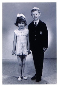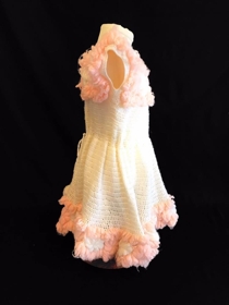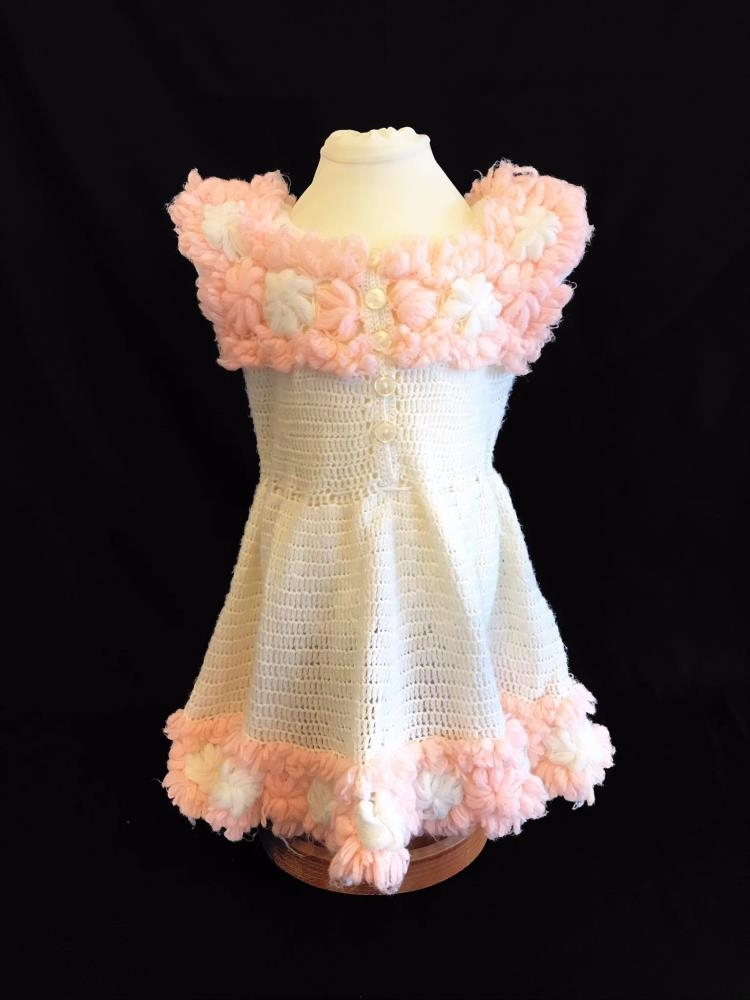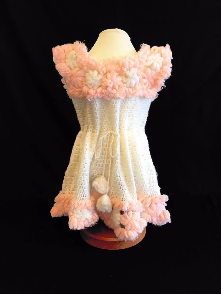 Barnakjóll hvítur og bleikur, heklaður með miklu blómamunstri á köntum og efri hluta. Tekinn saman með bandi með dúskum. Var t.d. jólakjóll Hólmfríðar.
