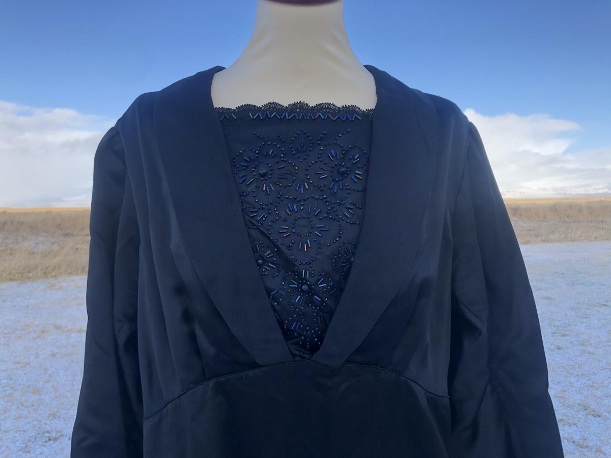 Svartur kjóll, heimasaumaður úr satíni eða silkibómull. Ísaumaðar svartar perlur fremst á ermum og brjóststykki að framanverðu, blúnda upp af brjóststykki. Kjóllinn tilheyrði Helgu Benediktsdóttur, Miðengi í Grímsnesi.