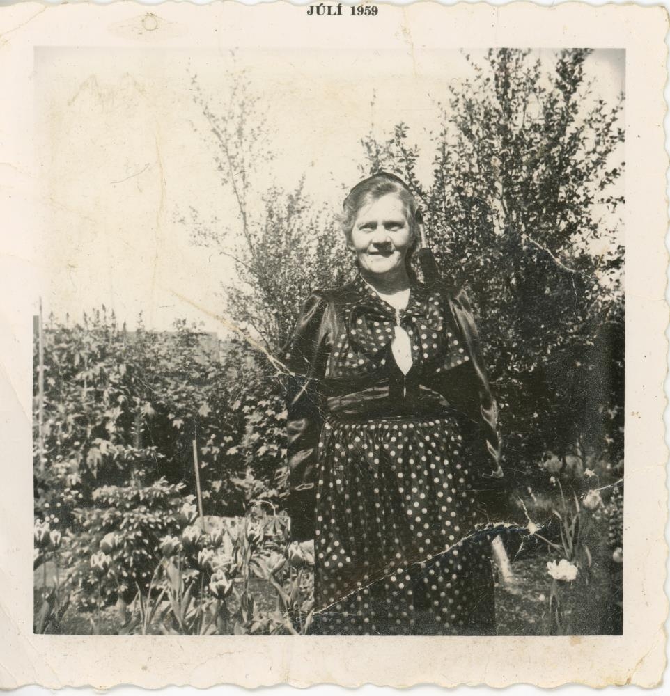 Á myndinni er fullorðin kona í peysufötum og með skotthúfu. Fyrir aftan hana er gróður, mögulega víðirunnar. Efst á kanti myndarinnar er skrifað "JÚLÍ 1959".