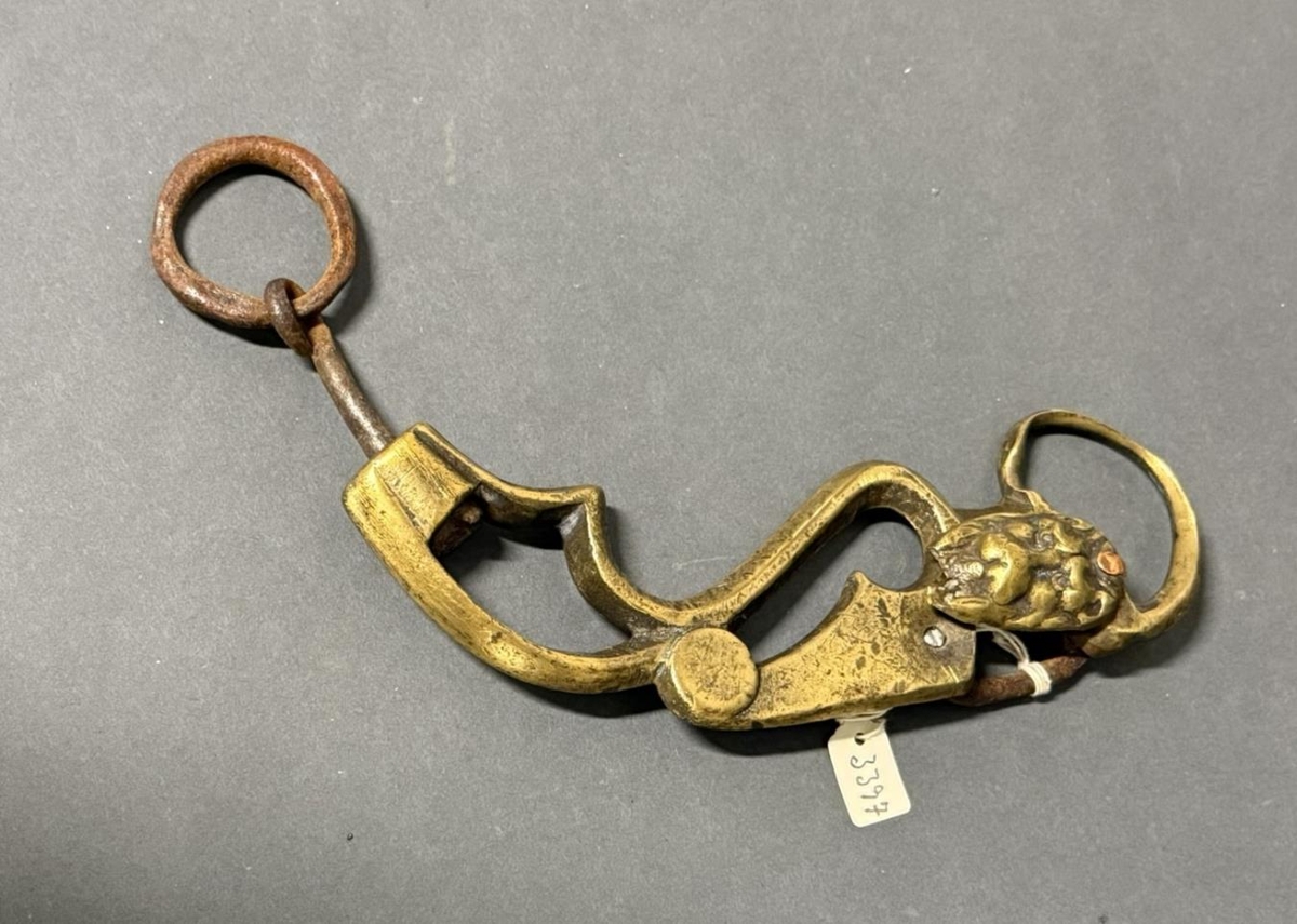 Beisliskjálki úr kopar. Er með ljónshaus, fallega gerðum. Neðan af hausnum hefur brotnað út frá gati.