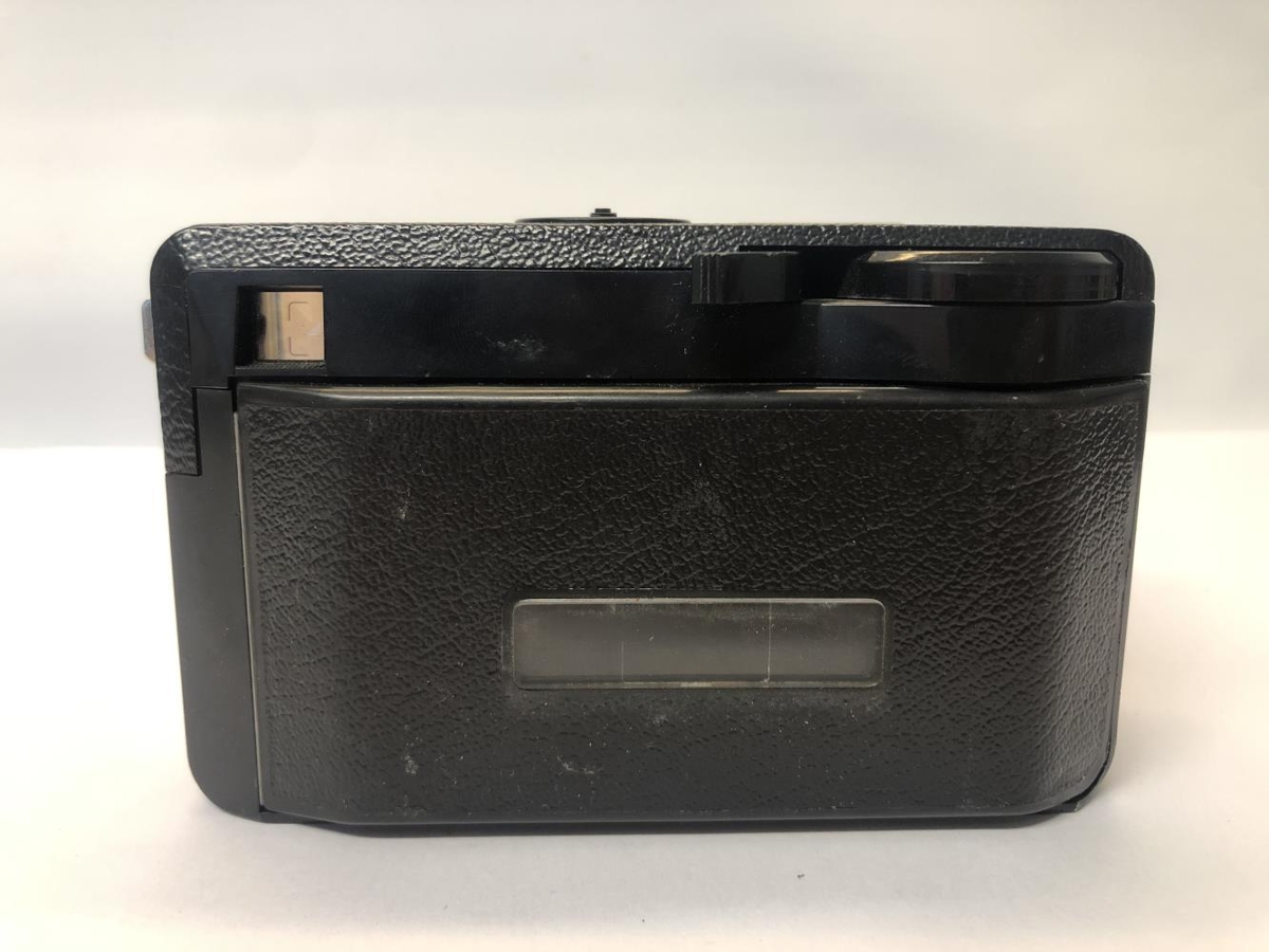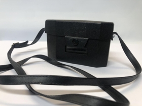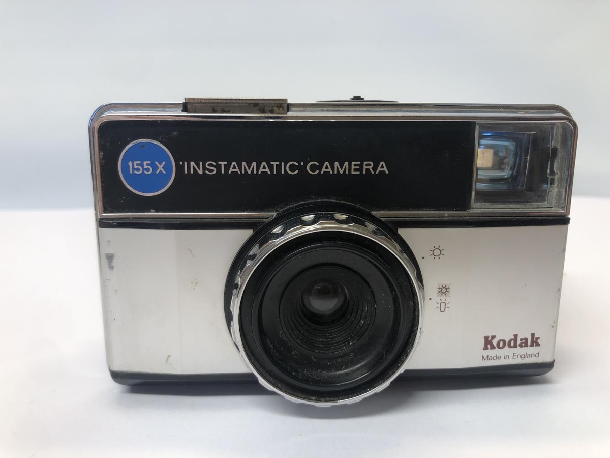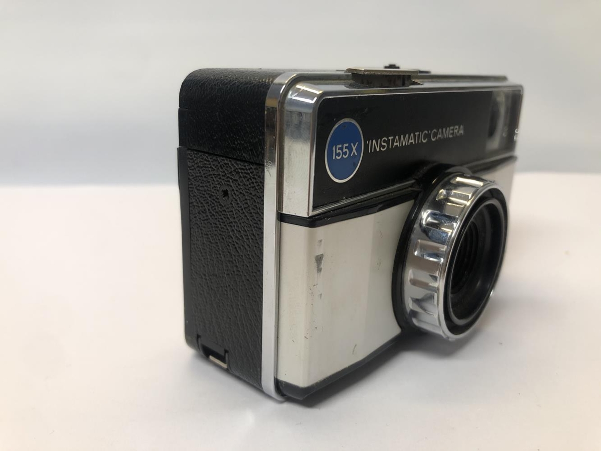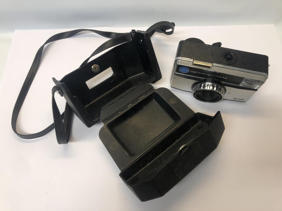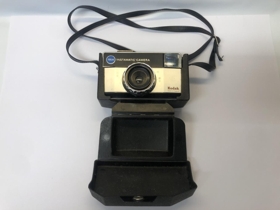 kodak-myndavél í töskun með ól. Vélin smellur ofan í töskuna sem er úr svörtu plasti. Myndavélin er af gerðinni Kodak Instamatic 155x. Úr eigu föður gefanda.