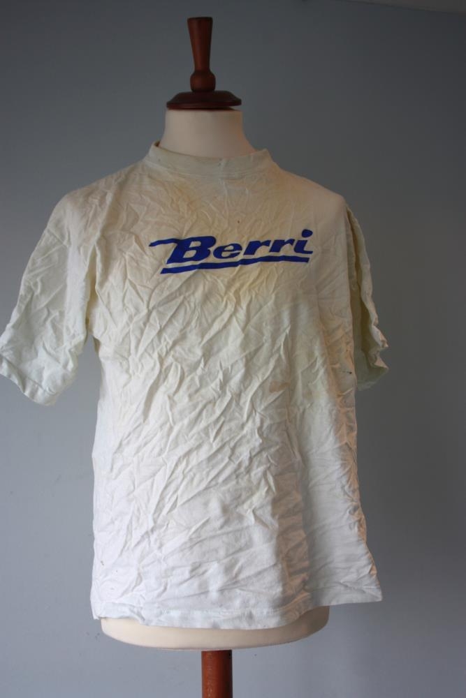 Kremhvítur bómullarbolur. Merkur á bringu "Berri".