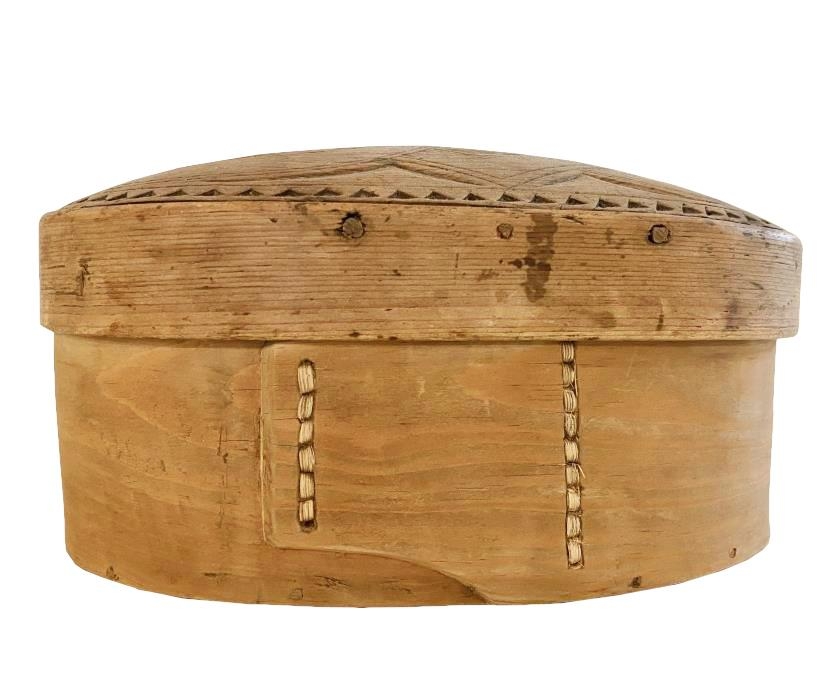 Smjöraskja úr tré með útskornu loki. Lokið er gamalt og útskorið með stórum tígli og tveimur hringjum. Það er neglt með trénöglum og saumað að aftan. Ílátið sjálft er nýrra. Það er úr einhverskonar krossviði og saumað með koparvír. Botninn er úr venjulegum viði, sennilega furu og festur með trénöglum.