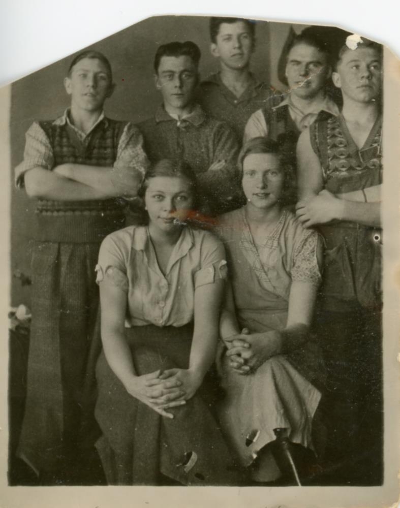 Fimm ungir menn standa í bakgrunni myndar og fyrir framan þá sitja tvær ungar konur.