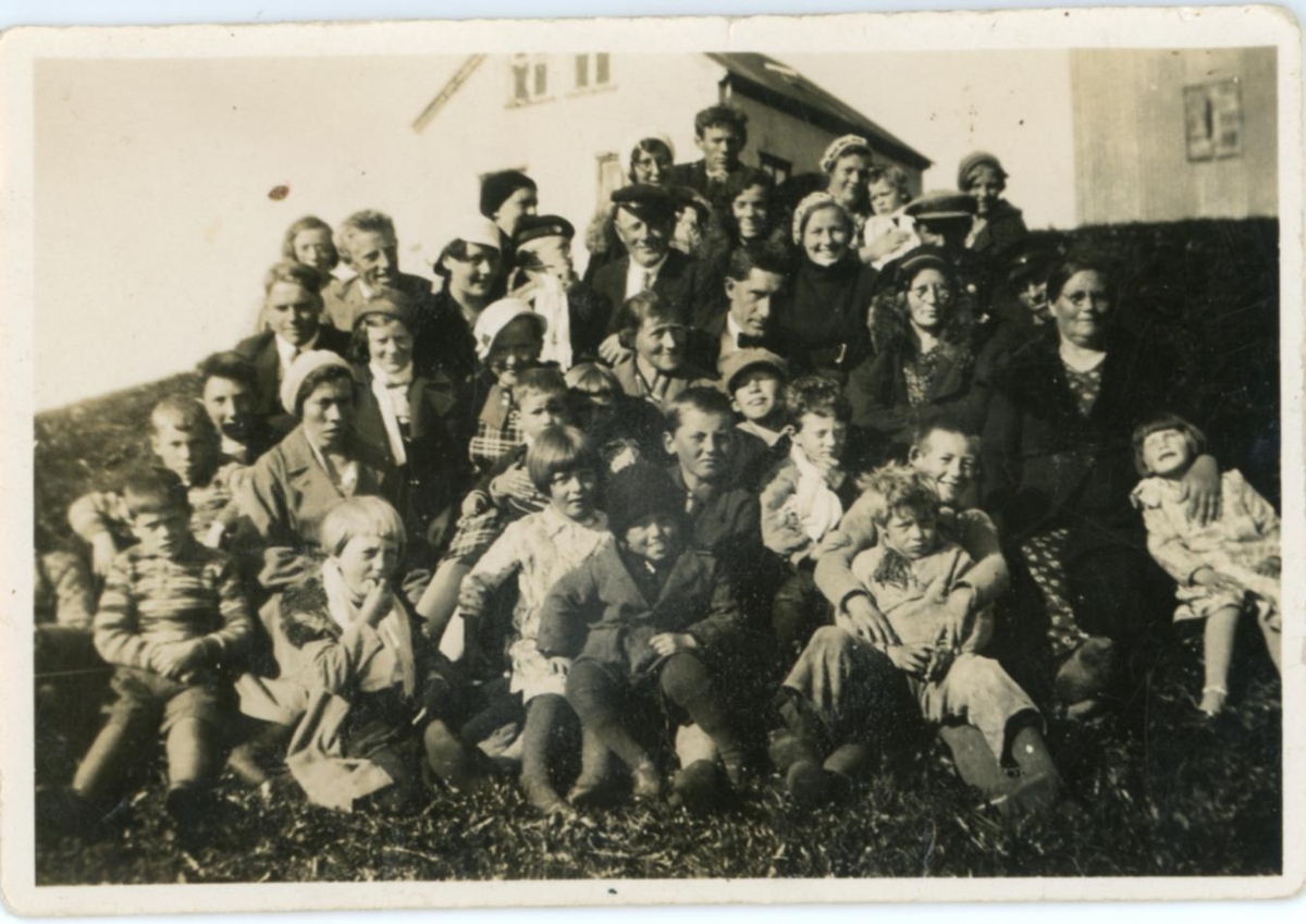 Stór hópur situr í brekku. Þar eru bæði börn og fullorðnir, konur og karlar. Í bakgrunni sést hús.
