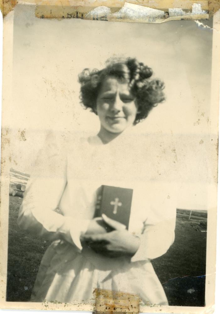 Stúlka með stutt, krullað hár stendur með sálmabók eða testament í höndunum á fermingardaginn sinn. Þetta er Alda Sigurðardóttir af Kaldrananesi.