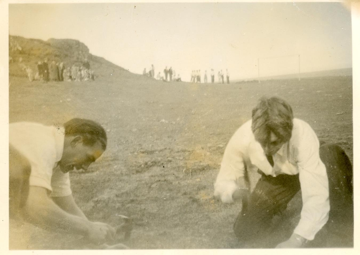 Tveir menn keppast um að negla í spýtur. Í fjarska, fyrir miðju, sést hópur fólks og til vinstri eru klettar með nokkrum manneskjum fyrir framan.