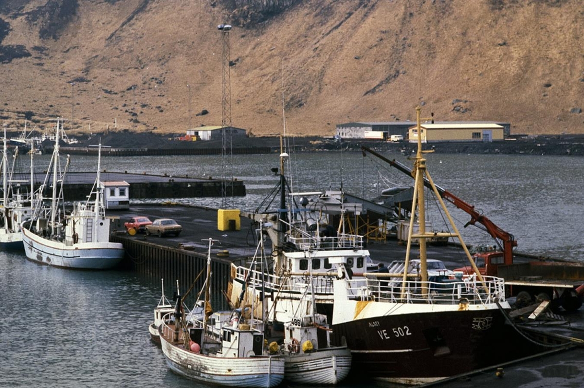 Heimaey - Vestmannaeyjar. Höfnin í Vestmannaeyjum. Álsey VE 502 við bryggju fremst, vörubíll með krana við hlið bátsins. Tvær trillur liggja utaná bátnum (486). Fólksbílar fjær. Ljósm: HS. febr., 1980.