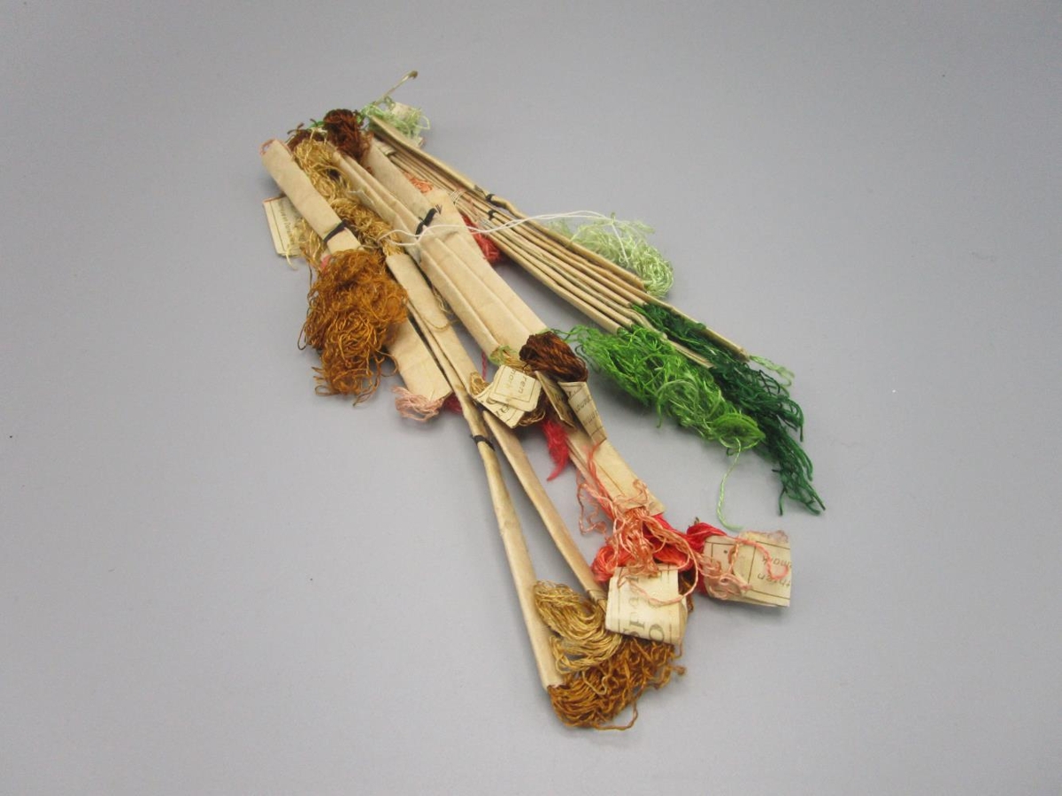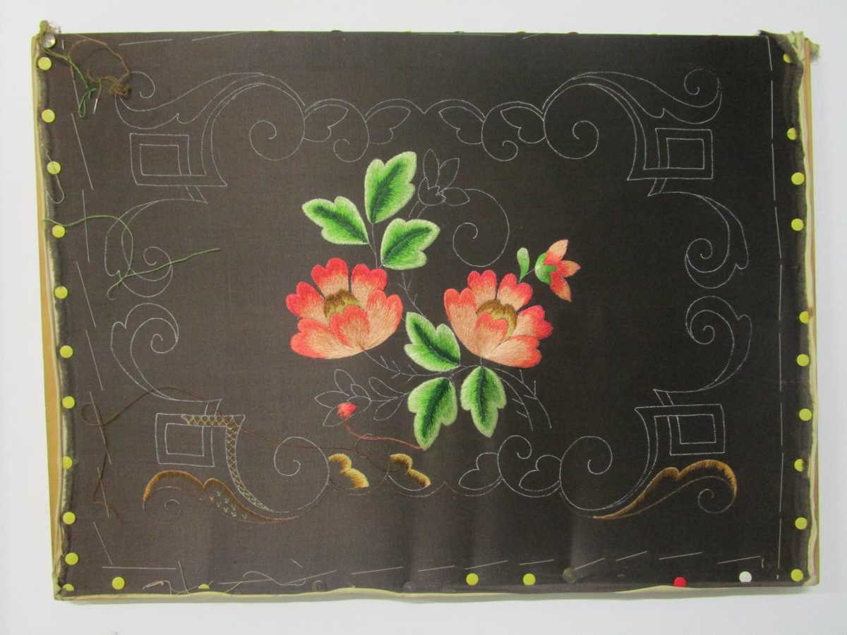 Útsaumsmynd hálfsaumuð með útsaumsgarni frá E. Kristínu Pálsdóttur frá Elliðaey, f.05.02.1902 - d. 24.07.1980. Langamma gefanda.
