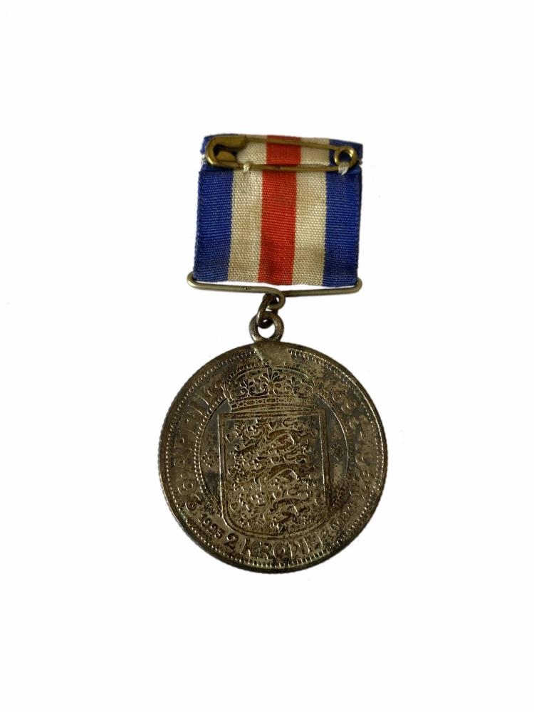 Tveir, tveggjakrónu silfurpeningar, silfurbrúðkaup 1898 - 1923 Chr. X og Alexandrine, bakhlið (sjá 1534) og konungaskiptin 1912.