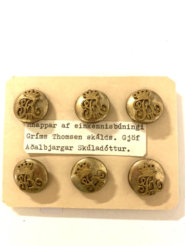 Einkennishnappar, gylltir, frá dögum Gríms Thomsen í utanríkisþjónustu Dana, 6 samstæðir.+ 3 samstæðir