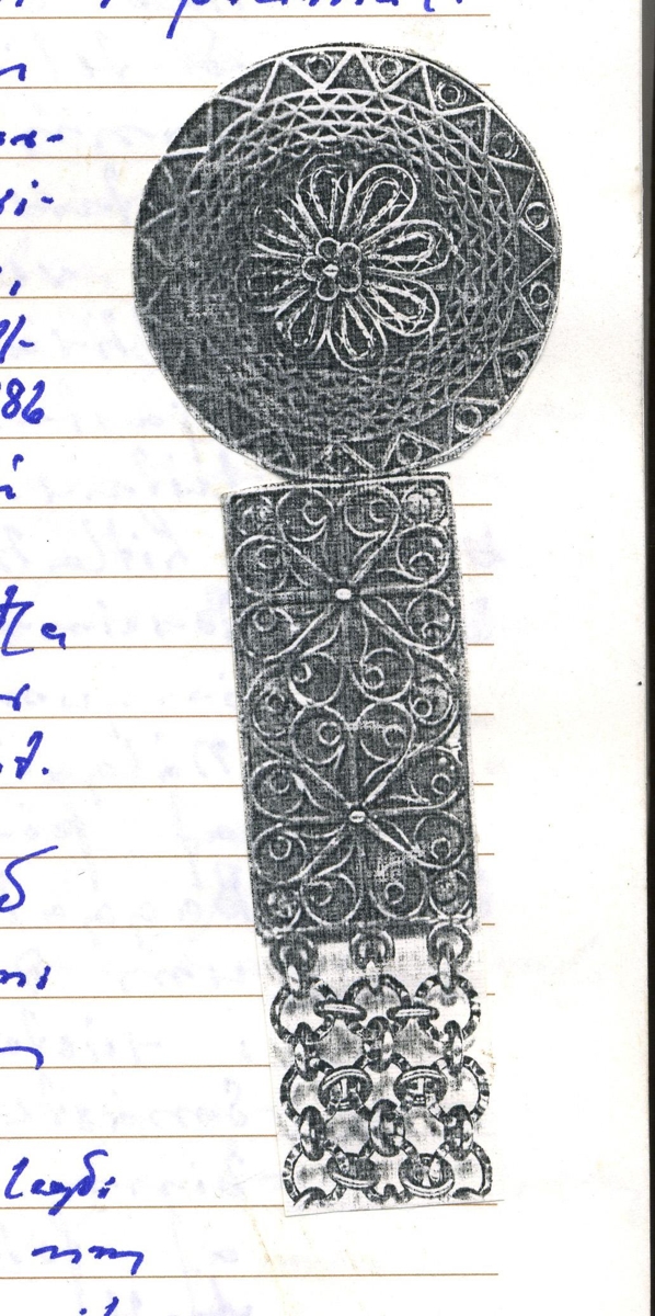 Stokkabelti, gyllt silfur með víravirki, 16 stokkar tengdir með hlekkjum, 4,5 x 2,5 cm og hringlaga skjöldur, 4,3 cm í þvermál. Stimpill á bakhlið sem sýnir að þetta er verk Páls Þorkelssonar gullsmiðs frá Eystri-Ásum í Skaftártungu, f. 1850, d 1936. Hann starfaði sem gullsmiður í Reykjavík 1872-1886 og beltið hlýtur að vera frá þeim tíma. Það er keypt í Antikversluninni Fríðu Frænku í Reykjavík og greiddar fyrir kr. 100.000. Átti að kosta samt. 150.000, en samningar náðust um niðurfærslu. Það hafði legið óselt í versluninni í 3 ár. Saga fékkst ekki en, prestfrú hafði átt það. Kona úr Rangárvallasýslu lagði út verðið fyrir safnið og er um það nafnleynd. Beltið er kjörgripur.