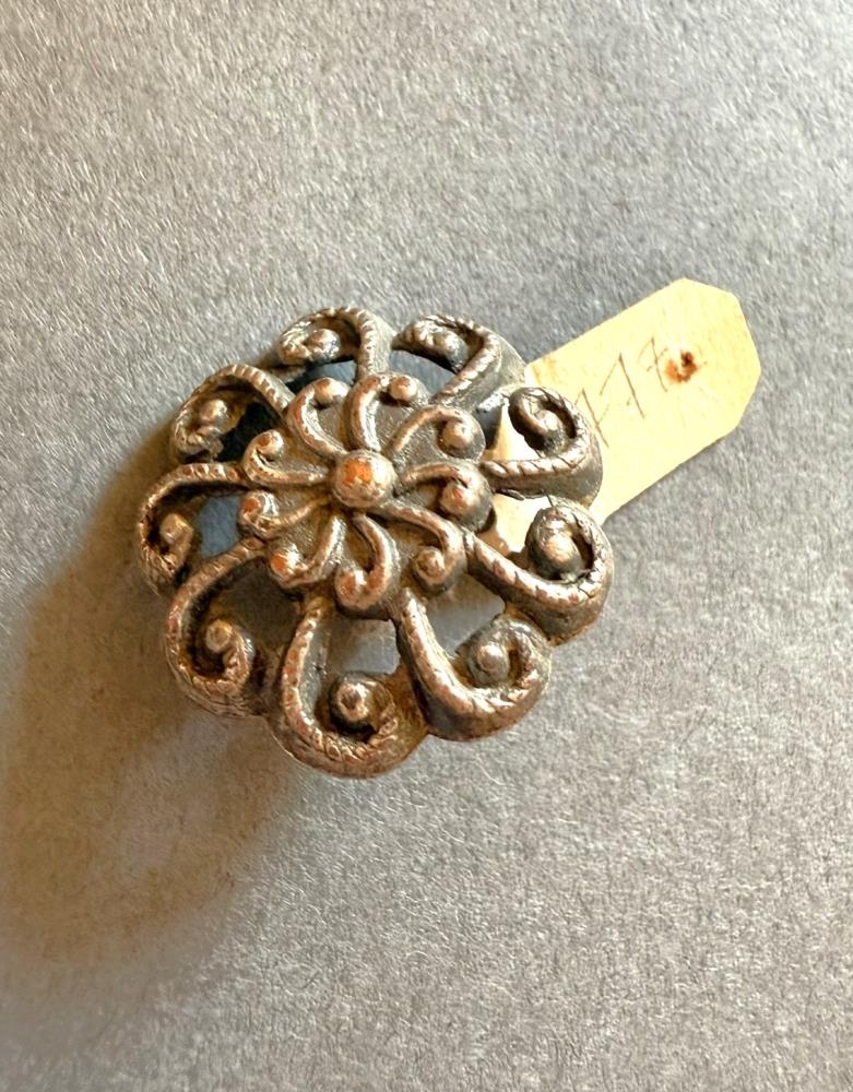 Samfelluhnappur úr silfri, steyptur, með fæti, þverm. 2,2 cm. Mun vera frá Gerðum í Landeyjum.