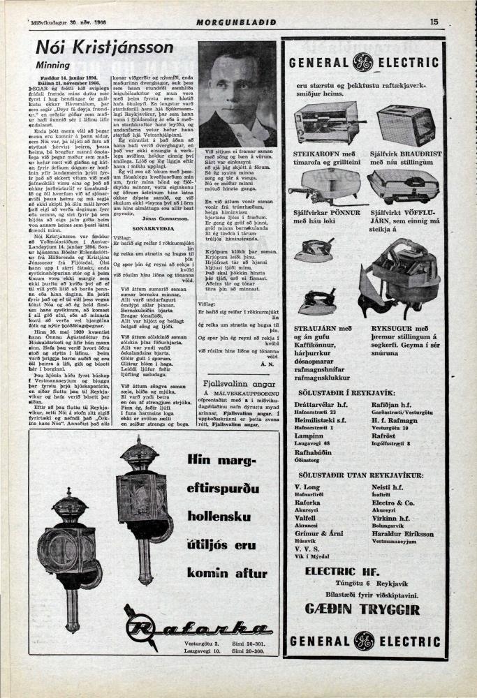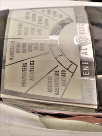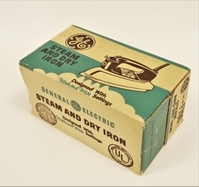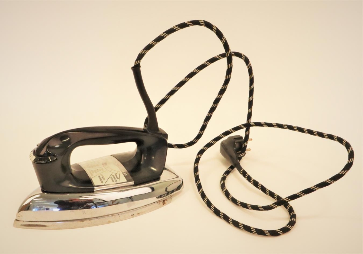 Straujárn úr járni, krómað járn fyrir miðju og handfang úr svörtu harðplasti. Gerð "General Electric". Upprunalegur kassi utan af járninu fylgir með. Áletrun á honum er m.a. : " Steam and dry iron. Designed with wash and wear settings".