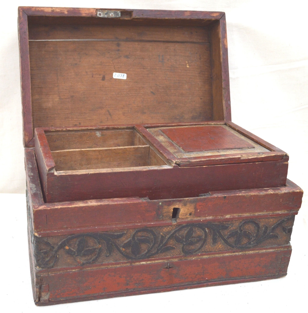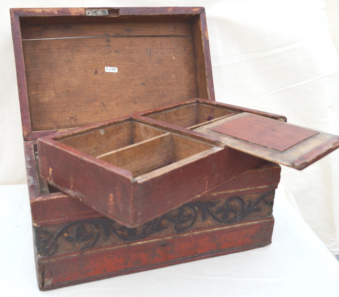 Saumakassi smíðaður og útskorinn af Jóni Þórðarsyni í Skammadal í Mýrdal d. 1879. Hæð 16,5 sm, lengd 30 sm, br. 18,5 sm. Kassinn er rauðmálaður, lok á hjörum og undir því fjórhólfa laus stokkur sem fellur út að opi. Hefur verið með tveimur rennilokum en annað vantar. Skrautbekkur skorinn allt umhverfis á hliðum og göflum. Sigurbjörg Pálsdóttir, Blönduhlíð 7 á kassa eftir Jón, með miklum útskurði. Þetta þarf að athuga með tilliti til söðuls Brands í Reynishjáleigu. Dánargjöf frú Guðríðar Jónsdóttur í Berjanesi í V-Landeyjum, afhent af dóttur hennar Pálínu Guðjónsdóttur.