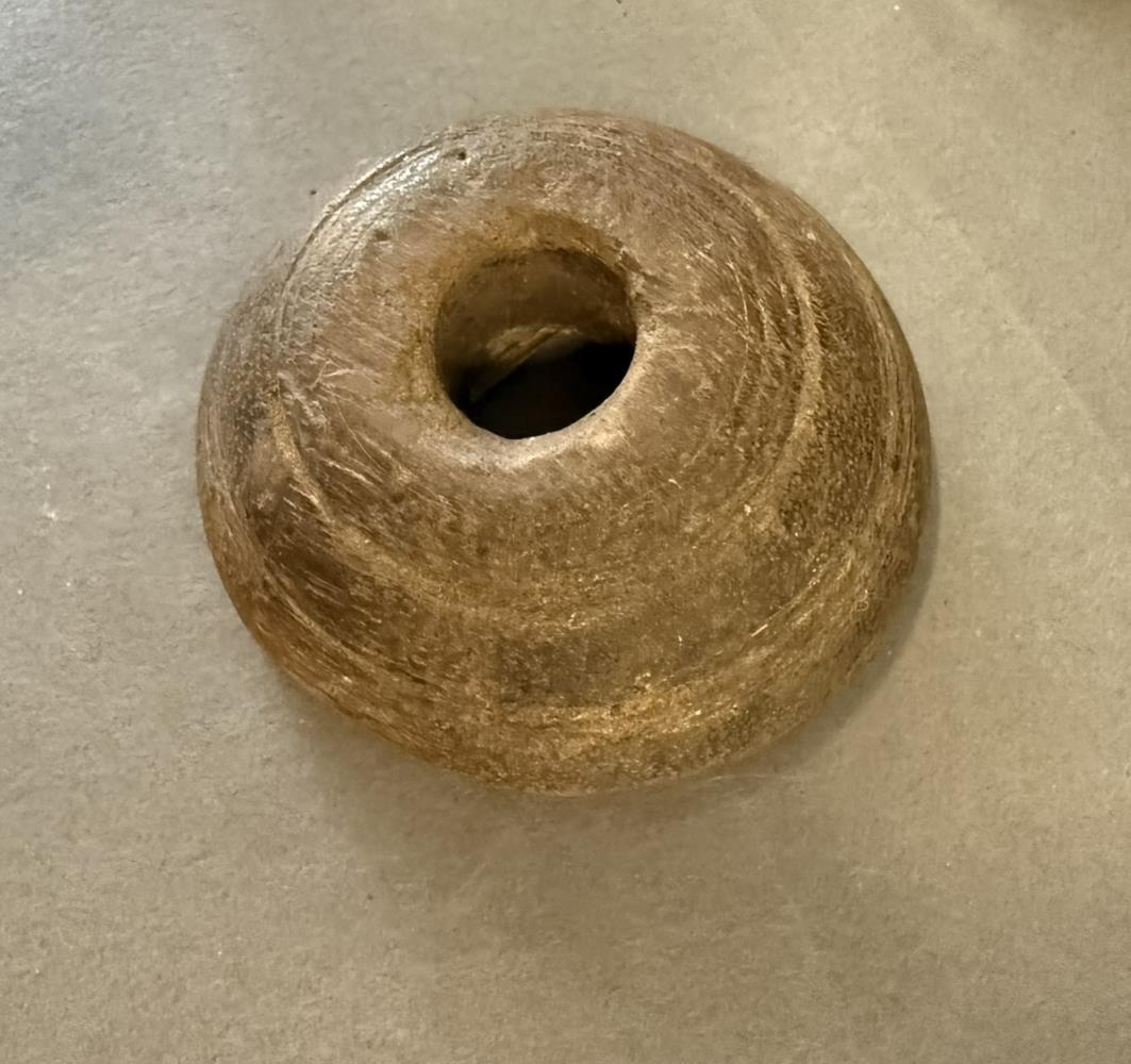 Lítill snældusnúður úr tré, renndur. Síðast notaður sem árenningur.