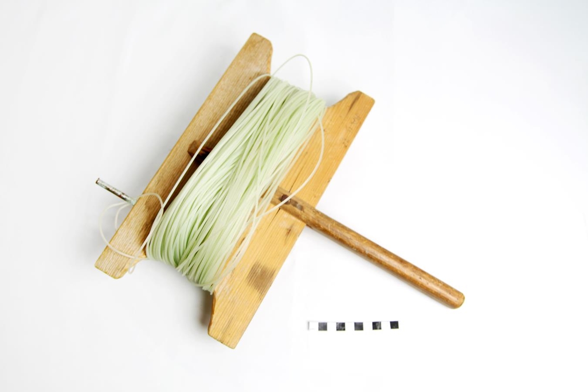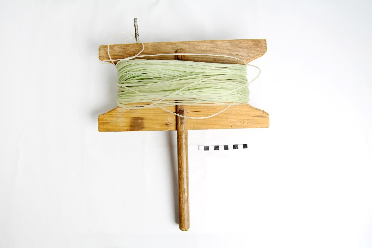 Jöklamælingaráhald. Tréspjald á skafti með nylonsnúru 100 metra að lengd. Til þess að mæla framskrið eða minnkun jökla á árunum 1934-1970