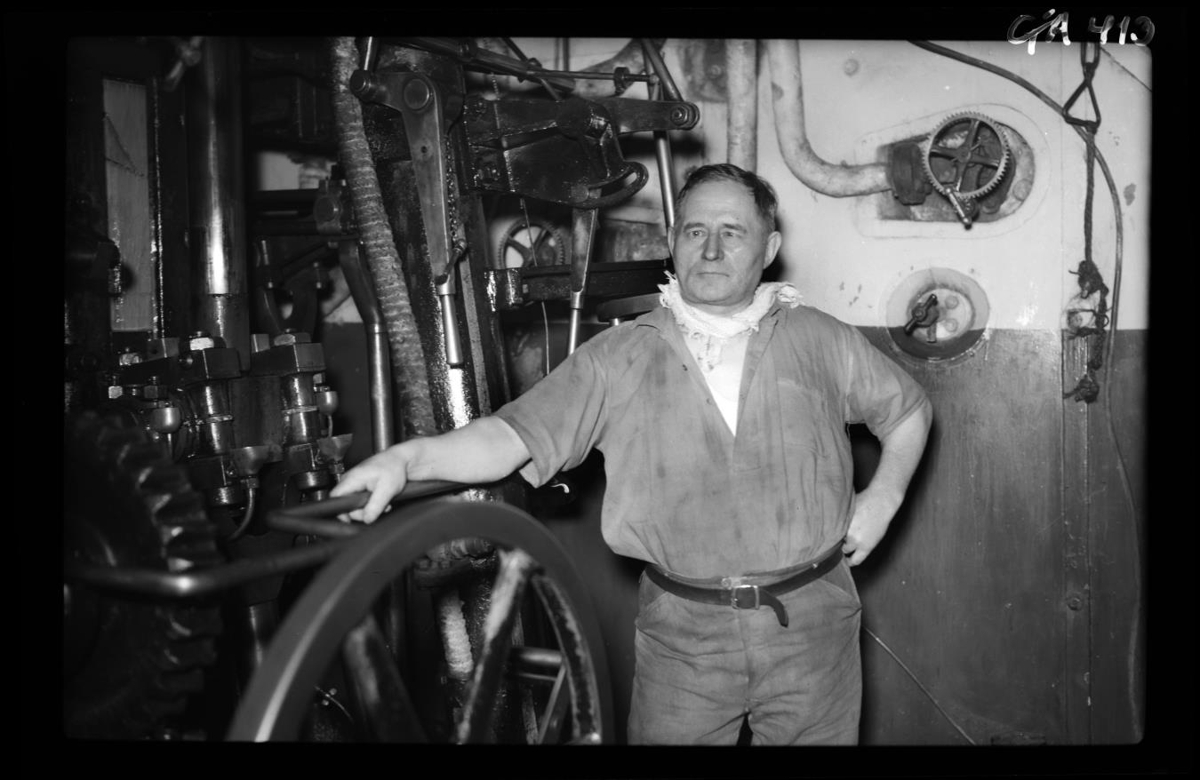 Í vélarrúmi skips. Þrír menn saman í hnapp. Tveir klæddir skyrtum og með klút um hálsinn, á buxum og með belti. Lengst til hægri maður á samfestingi. Vélin vinstra megin, en ketillinn í bakgrunni. Á honum sést "telegrafinn", hringlaga með enskum orðum á.