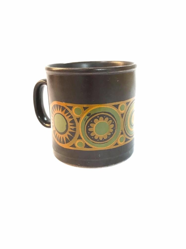 Brúnn bolli með stóru blómamunstri. Appelsínugul blóm.