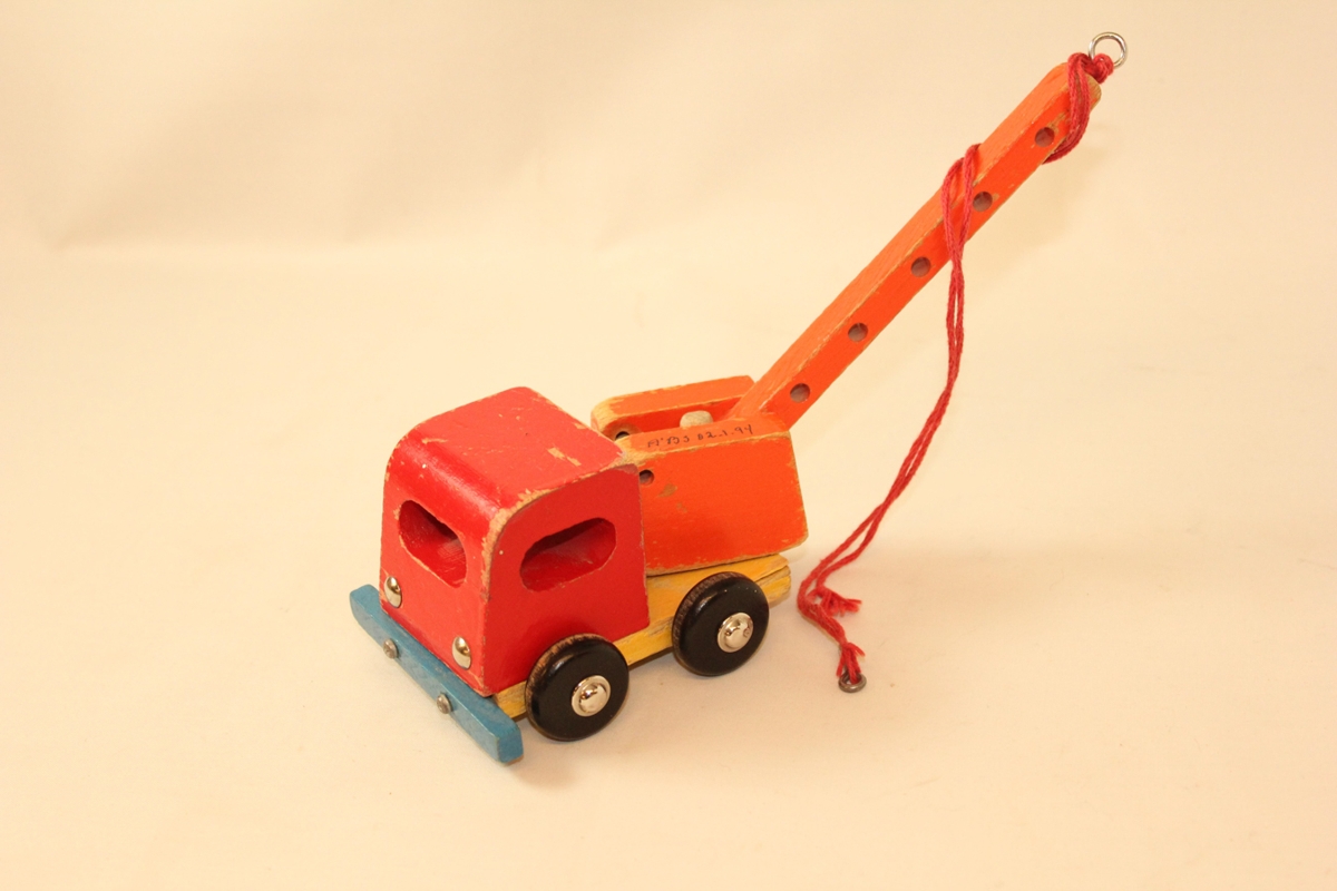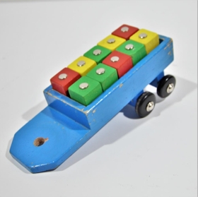 Leikskólaminjar. Vörubíll / sturtubíll með krana sem hífir kubbana / segull / 8 hjól. Til að þroska : hugmyndaflug - fínhreyfingar - skilning á segulstáli.