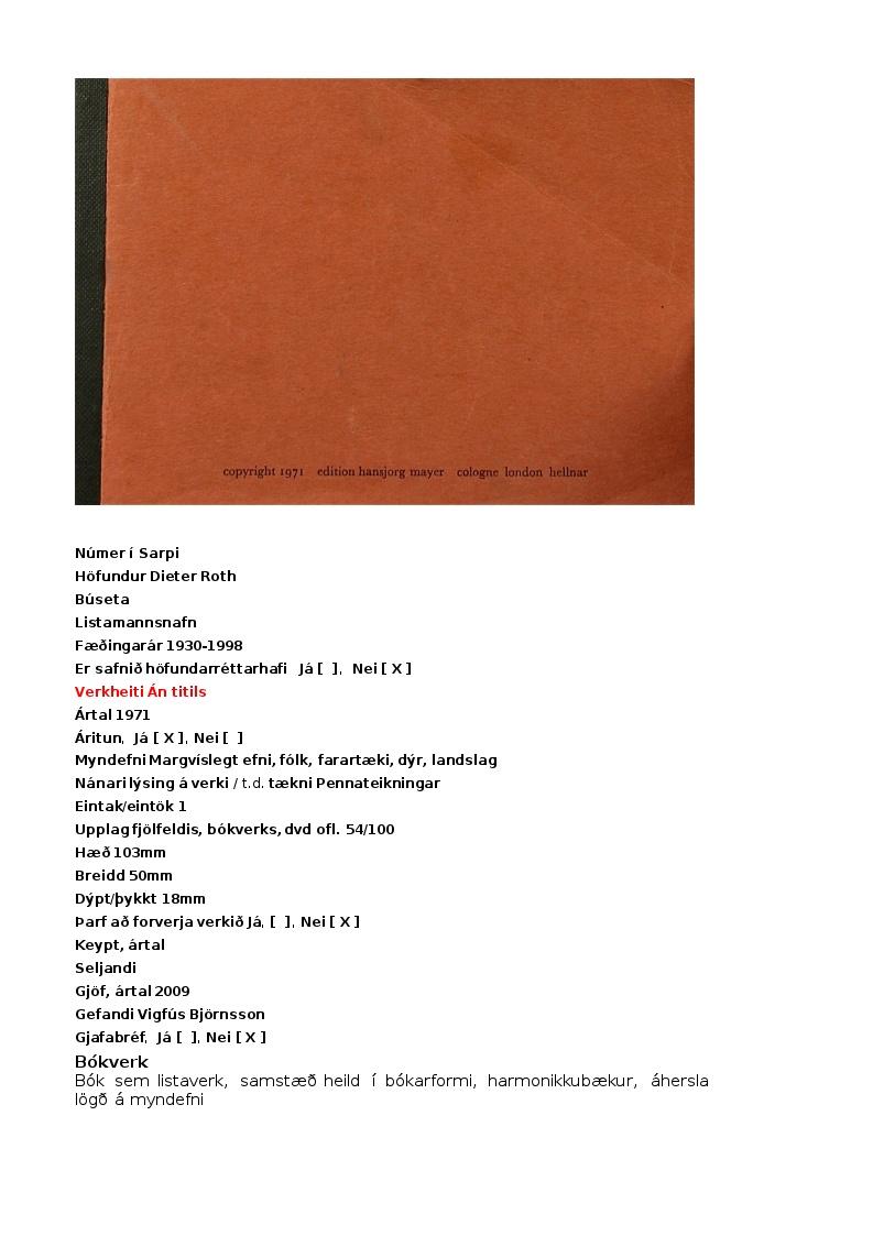 Til baka í leitVeistu meira?Vista í mitt safnPrentaAfrita slóðPanta myndNotkunarskilmálarÁn titils= 1971, Dieter RothVarðveitt hjáSafnasafnið - Alþýðulist ÍslandsAðrar upplýsingarTitillVerkheiti: Án titilsÁrtal= 1971SafnnúmerSafnnúmer A: S-1313Stærð10 x 5 x 1.8 cmAðfangategundMyndlist/HönnunUndirskrárUndirskrá: Almenn listmunaskráFlokkunBóklist, Bókverk