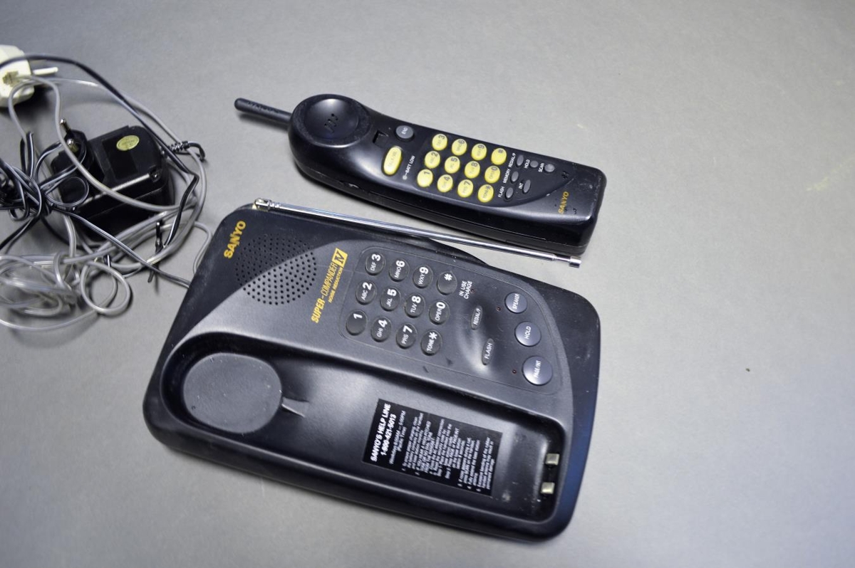 Þráðlaus sími frá 1997, svartur af tegundinni Sanyo Super Compander. Takkasími.