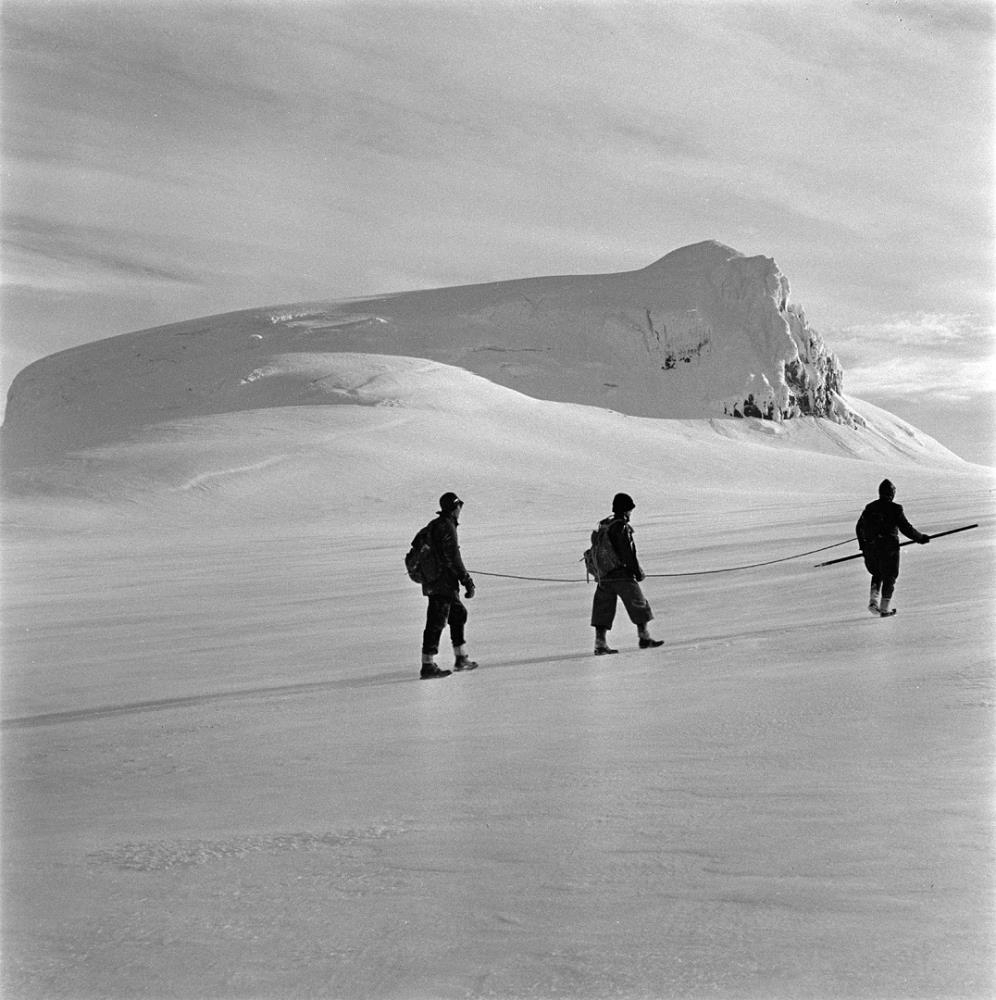 A-Skaftafellssýsla. Óþekkt. Þrír karlmenn ganga á jökli ? Lengst til vinstri Oddur á Skaftafelli ?