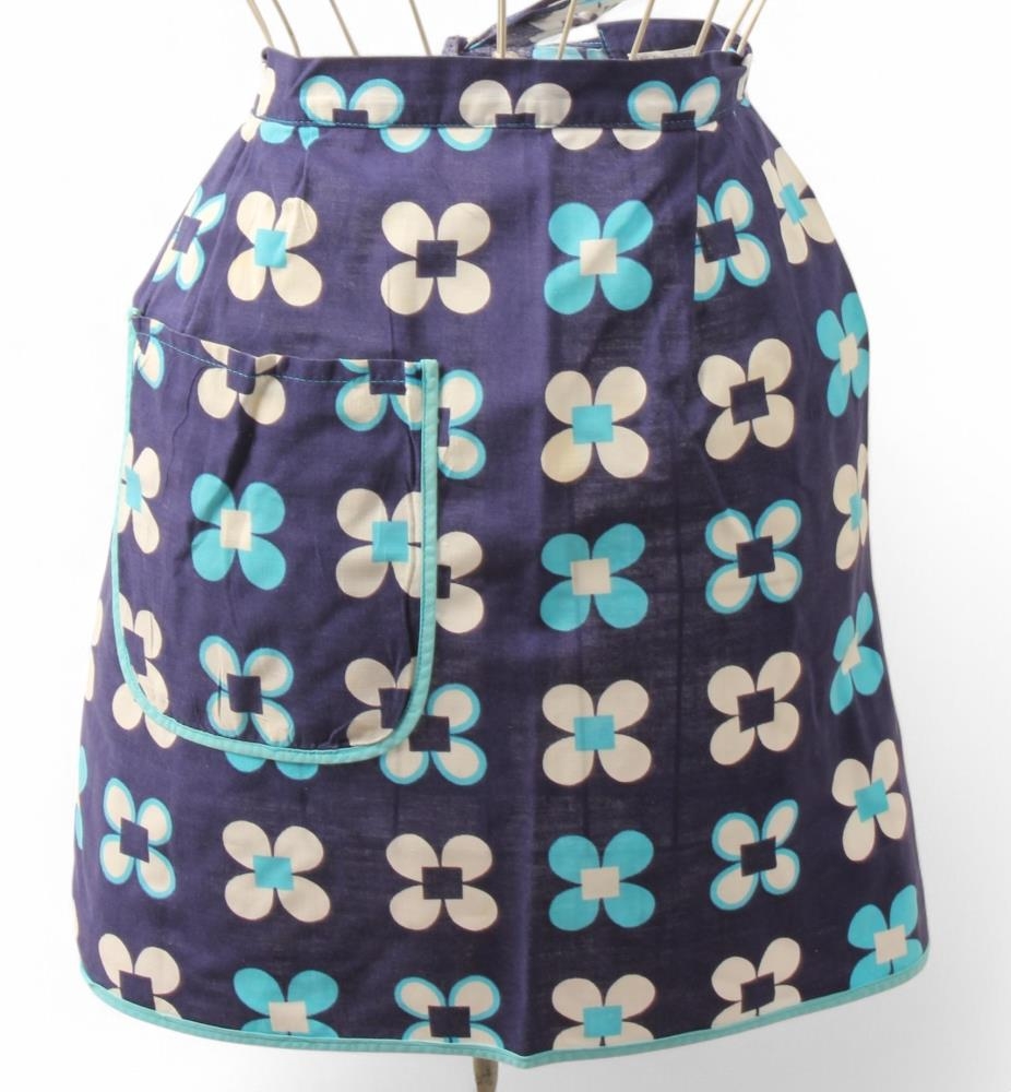 Mittissvunta með einum stórum vasa og hvítum og bláum blómum, í grunninn er hún dökkblá.