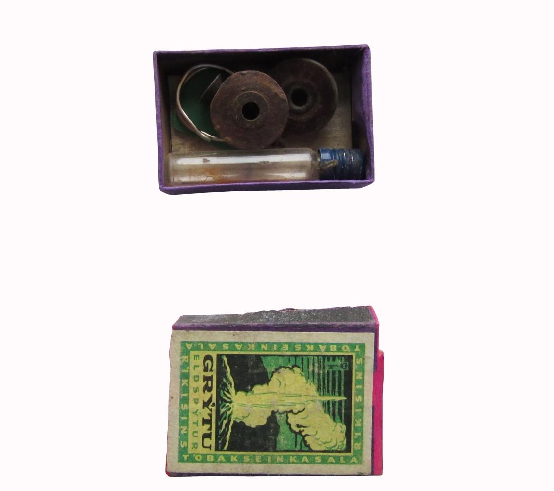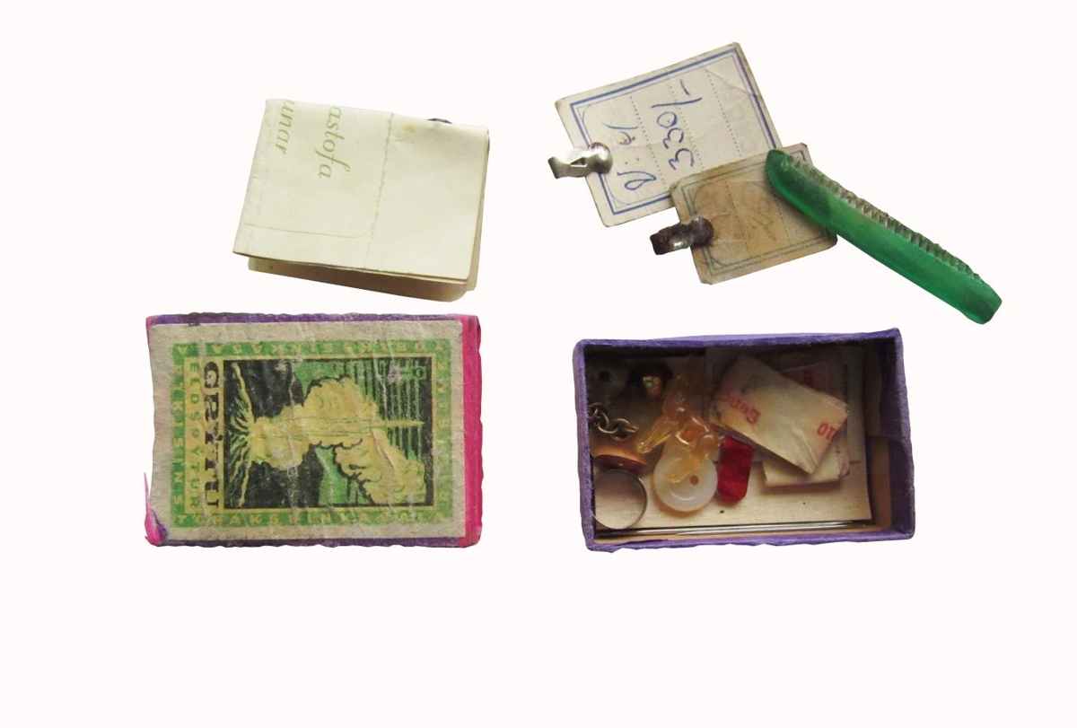 Eldspýtustokkar með ýmsu smádóti ofan í. Gefandi er Sigurður Norland í Hindisvík á Vatnsnesi í Vestur-Húnavatnssýslu.
