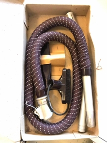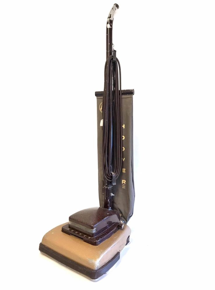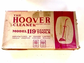 Ryksuga af gerðinni Hoover. Brún og gyllt að lit. Þungur stór málmhaus neðst og ryksugupoki hangandi á háu haldi. Með henni fylgja upprunalegar umbúðir undan aukahlutum, ryksugustútum og barka. Kassinn er brúnleitur og á honum stendur : The Hoover Cleaner. Registered Trade mark. Model 119. Cleaning Tools. Manufactured by Hoover Limited. Perivala. Greenford. Middlesex. England. 51x27x8 cm.