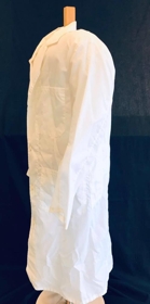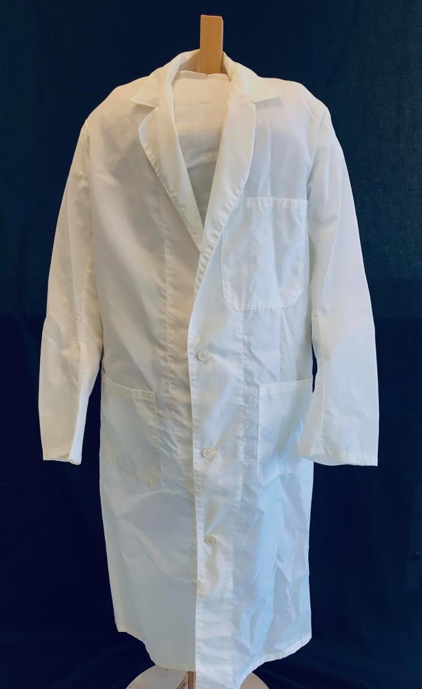 Hvítur síður sloppur úr einhverskonar plastlegu efni. Hnepptur með 4 tölum frekar neðarlega. Tveir vasar neðarlega á hvorri hlið og einn brjóstvasi. Gæti hafa verið saumaður í Írisi á Akureyri, en ekkert merki er á honum.