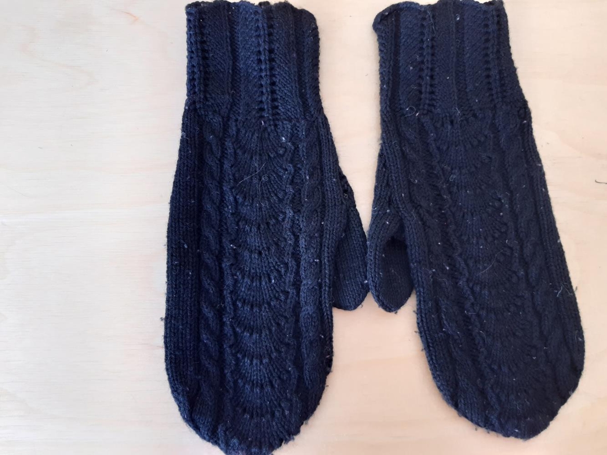 Svartir vettlingar, á baki krónuprjón, þumall með sléttu prjóni.
