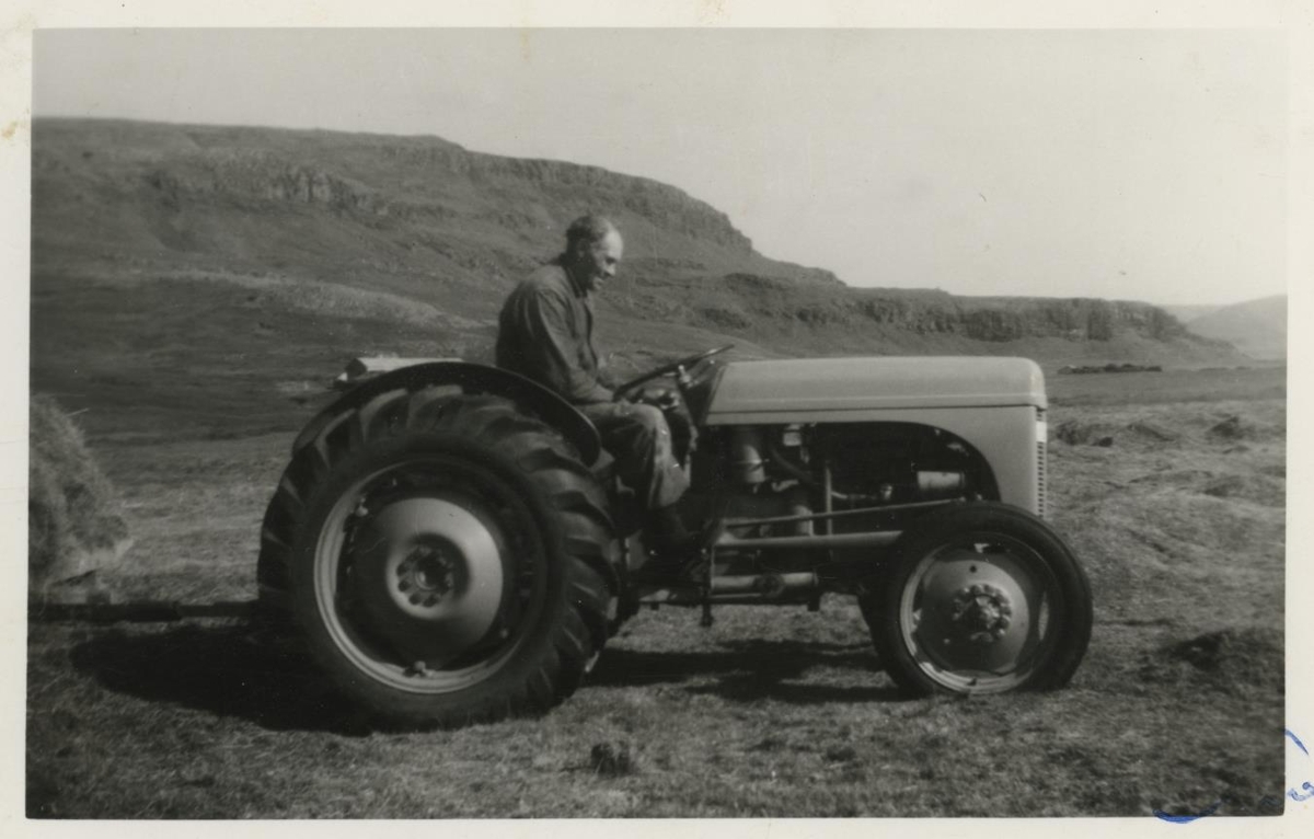 Kristvin Jónasson í heyskap á Leikskálum í Haukdal.