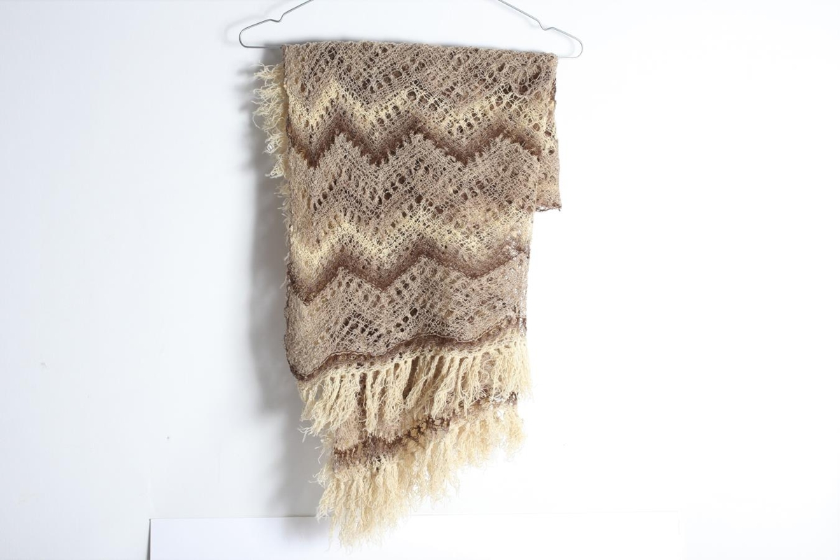 Sjal prjónað úr ull. Gert af Aðalbjörgu Sigurðardóttir (1890-1973) frá Húsey. Talið vera frá 19. öld. Í klassísku sauðalitunum með hvítleitu kögri.