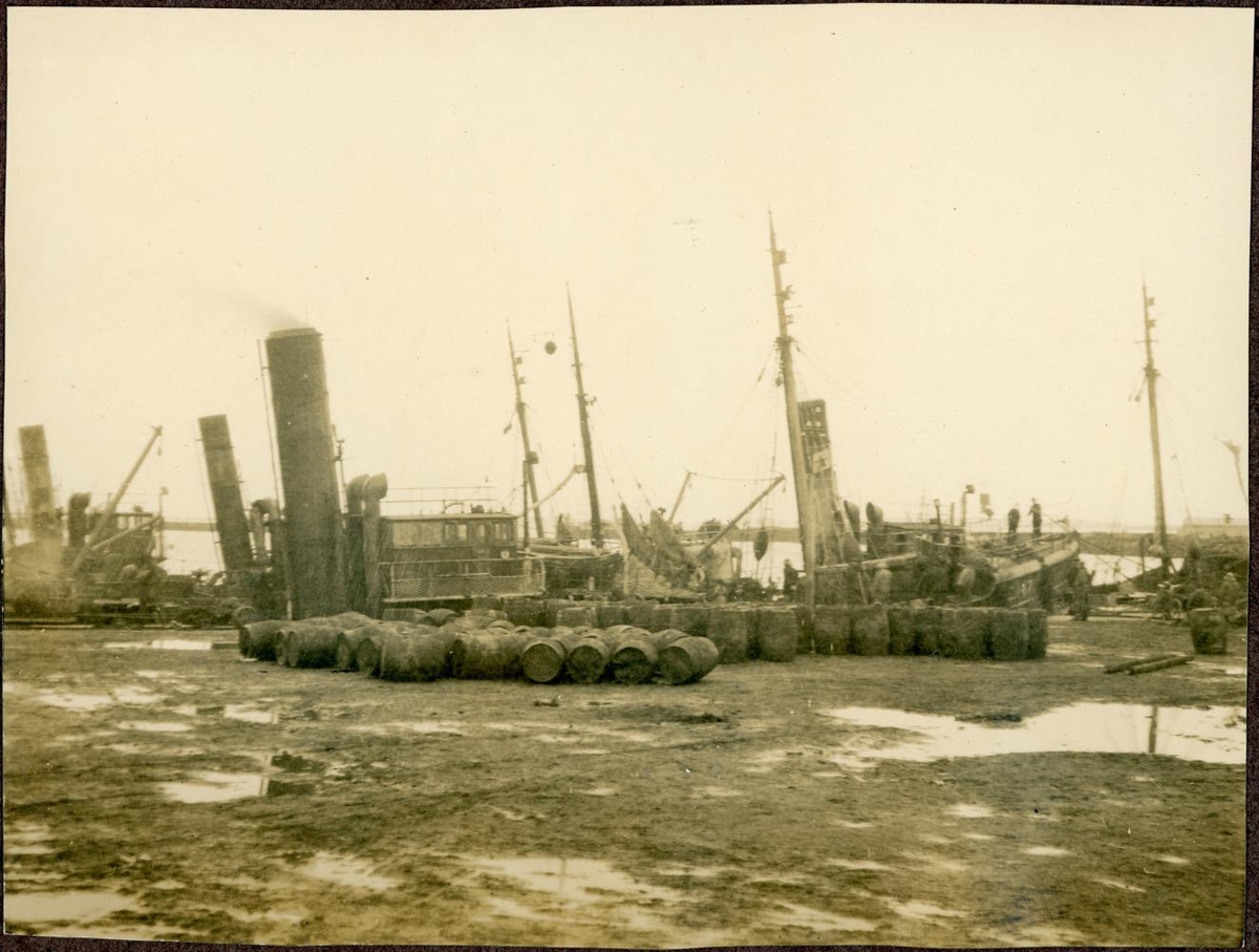 Frá Reykjavíkurhöfn. Togarar liggja við hafnarbakka, á bryggjunni ligga olíutunnur úr járni. Á togaranum næst bryggju má lesa RE 147 á kinnungnum.