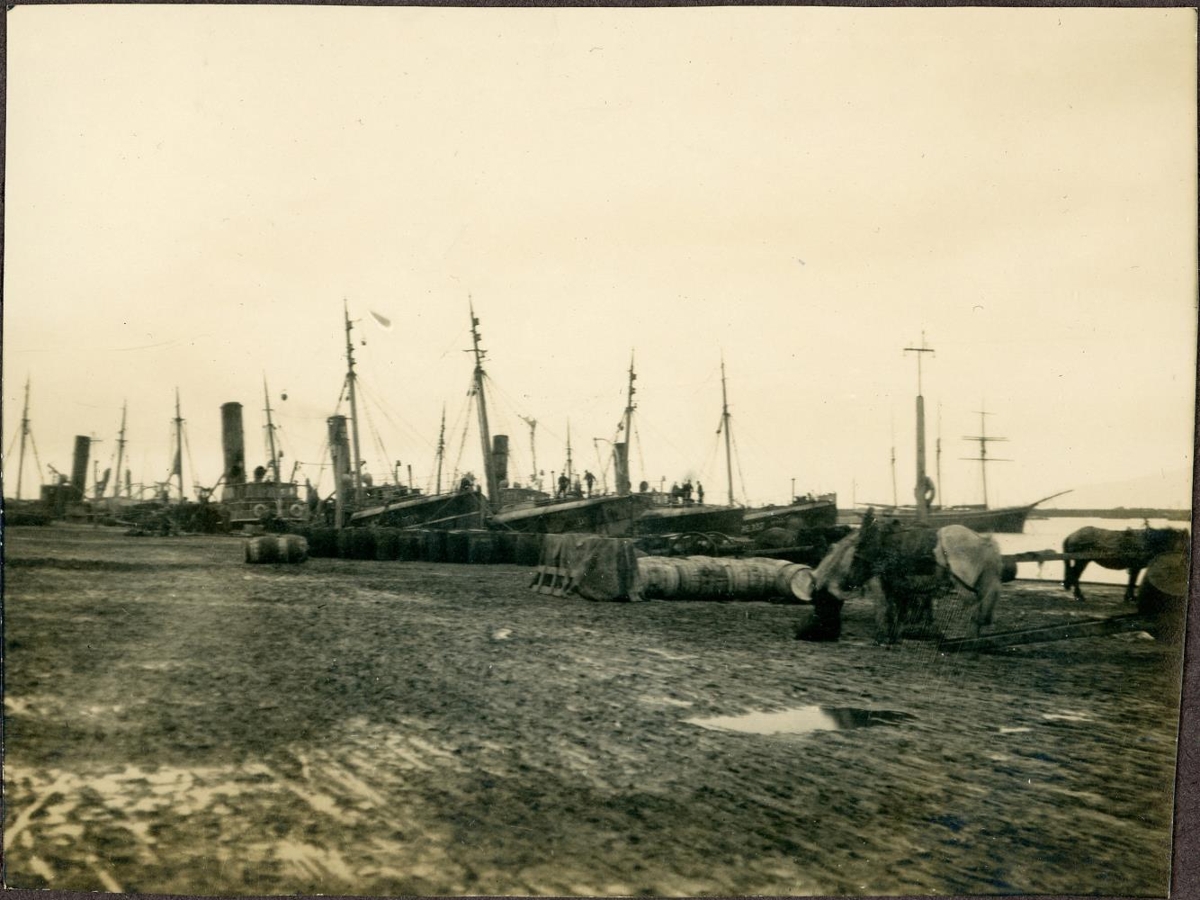 Frá Reykjavíkurhöfn. Fjöldi gufuknúinna togara liggur við bryggju, á bakkanum hjá þeim liggja olíutunnur úr járni og trétunnur nær.